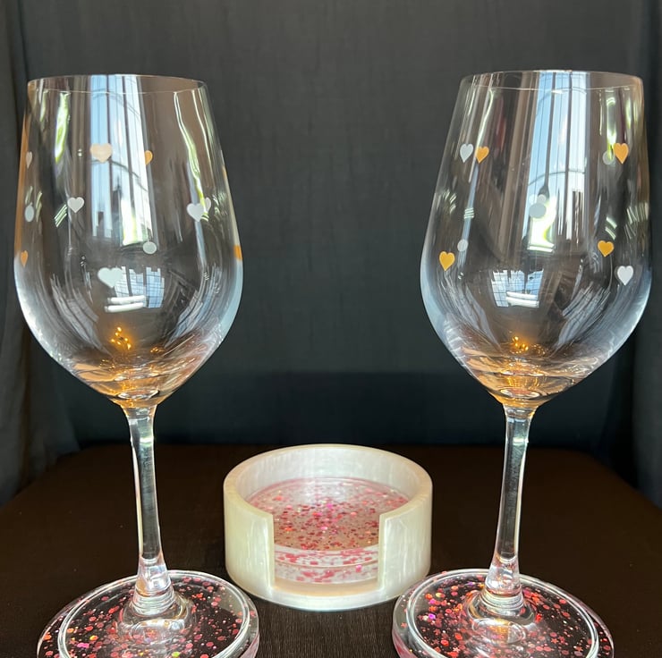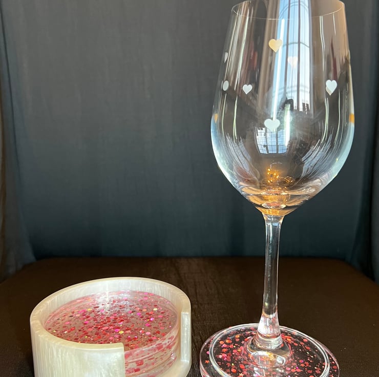 Beautiful set of 4 circular coasters with holder made with Epoxy resin. (Wine glasses not included)