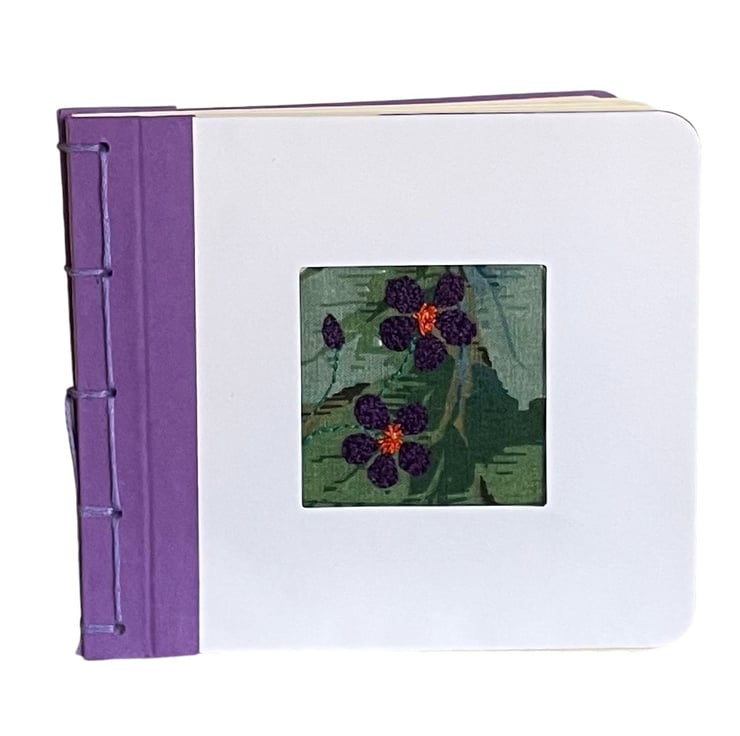 The paper has rounded corners and the cover is decorated with a hand embroidered fabric swatch.
