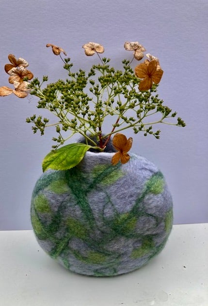 This is a one off handmade piece and the nature of the wool gives it a unique shape. Being wool you obviously cannot put water in it, but as you can see from the photograph you can put dried flowers in it, or just have it as a beautiful statement piece.