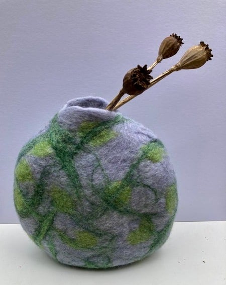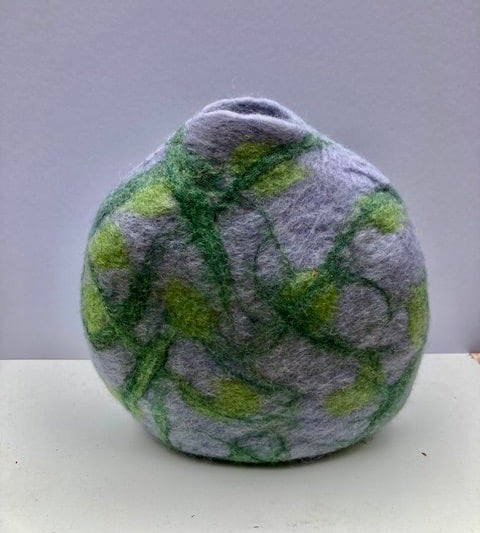 This textural, organically shaped felted, wool vase has been made with grey merino wool & embellished with green merino wool and green sari silk. The vase has been made using the wet felting process, by rubbing and rolling the wool and then shaping it.