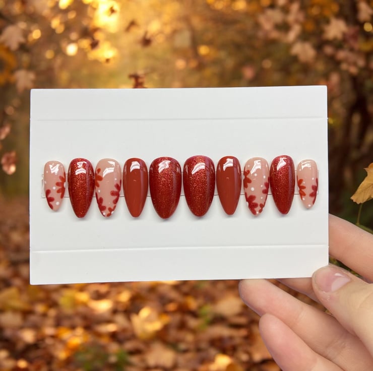 Custom hand painted gel nails, each set comes with a nail prep and application kit.