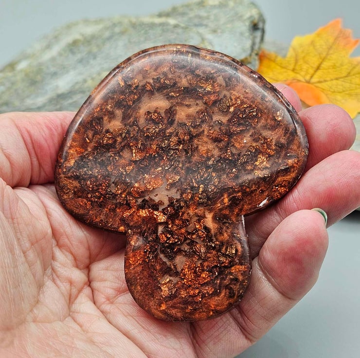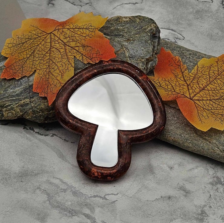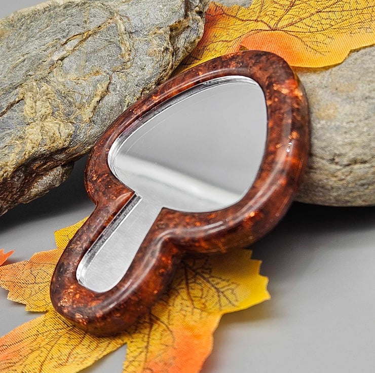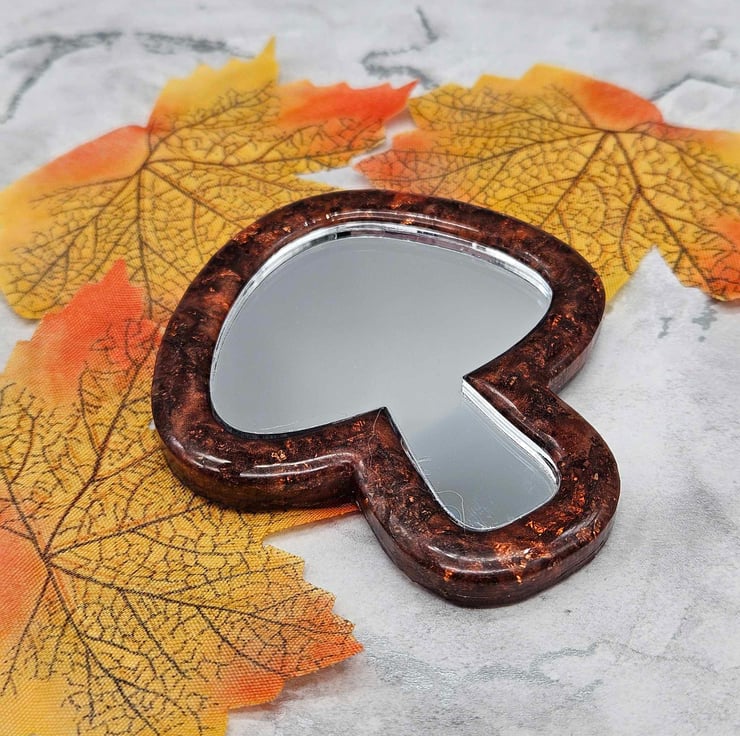 This elegant mushroom pocket mirror has been made with epoxy resin, coloured with a small amount of copper mica powder, and added coppery coloured foil flakes. The mirror used is mirrored acrylic.