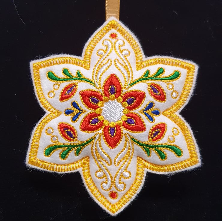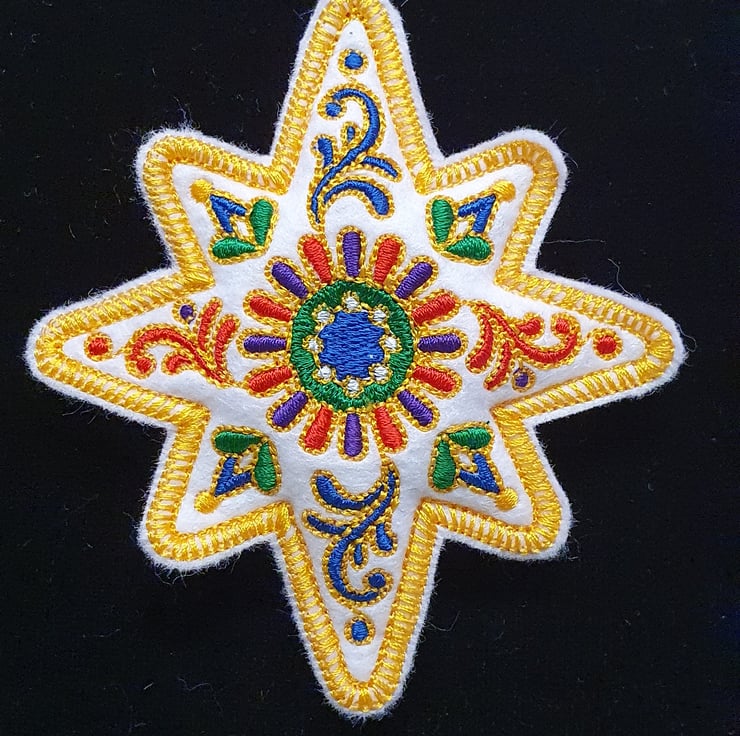 Machine embroidered design on washable felt and filled with hypoallergenic fiberfill.