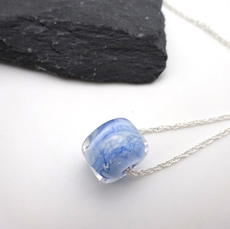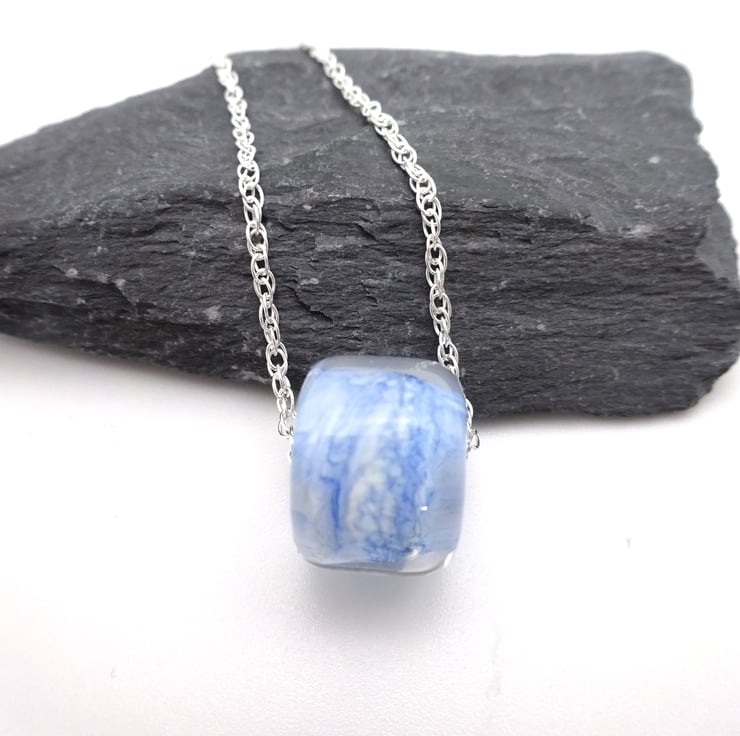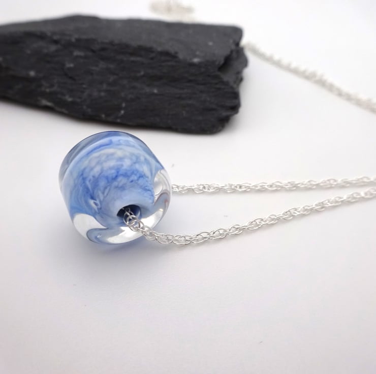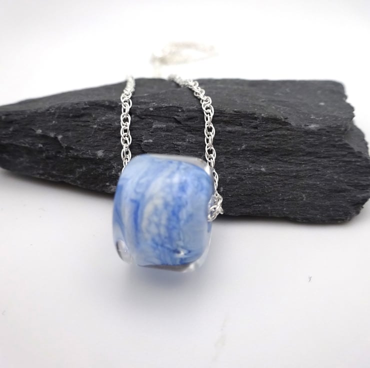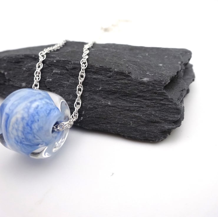 It features a sterling silver chain strung with a handmade lampwork glass blue bead.