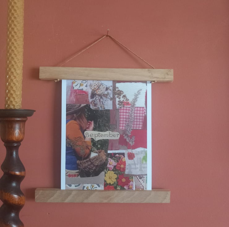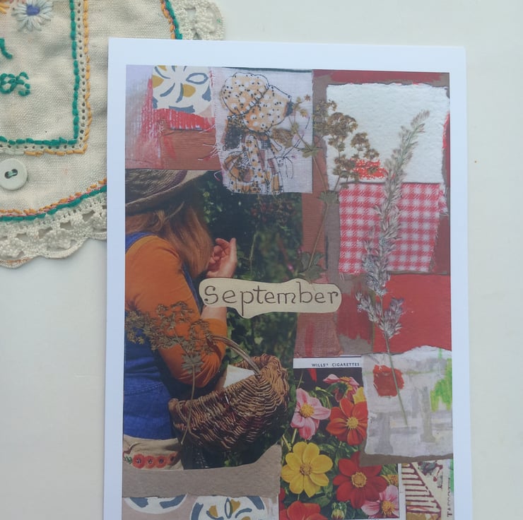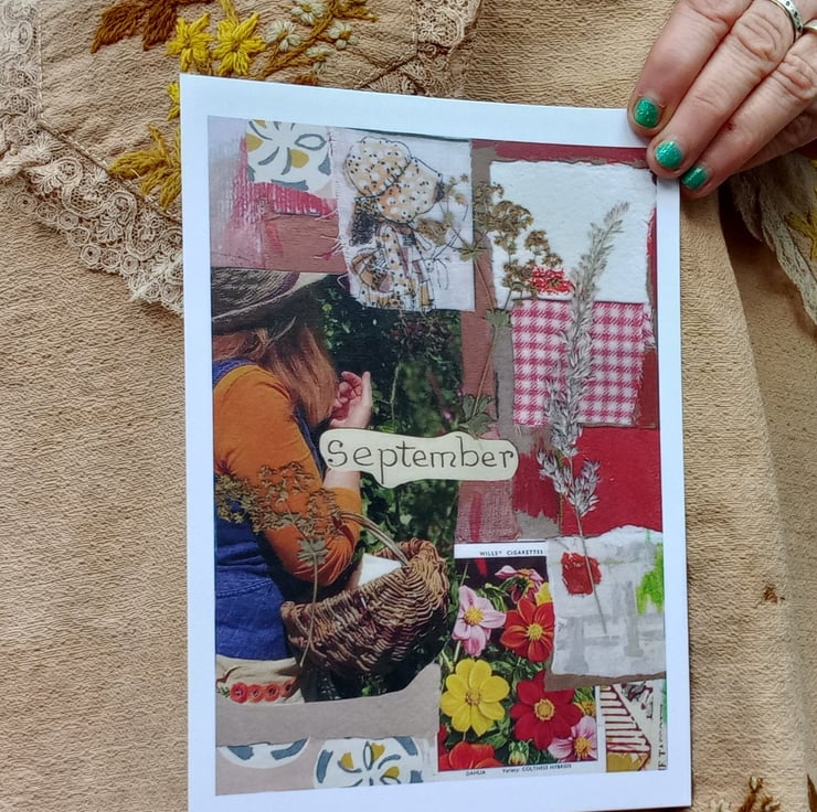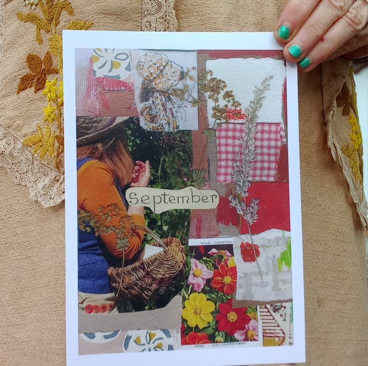 A5 small print from an original collage by artist hesta Singlewood. beautiful mix of paper, and vintage fabrics in the original. this A5 print. It is romantic and captures the essence of late summer and harvest time flowers weave through the collage, enchanting and whimsical for a September birthday, anniversary or seasonal home decor.