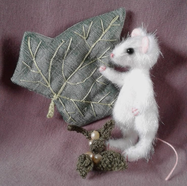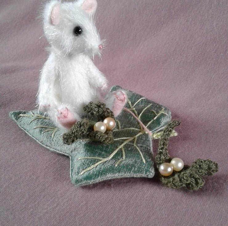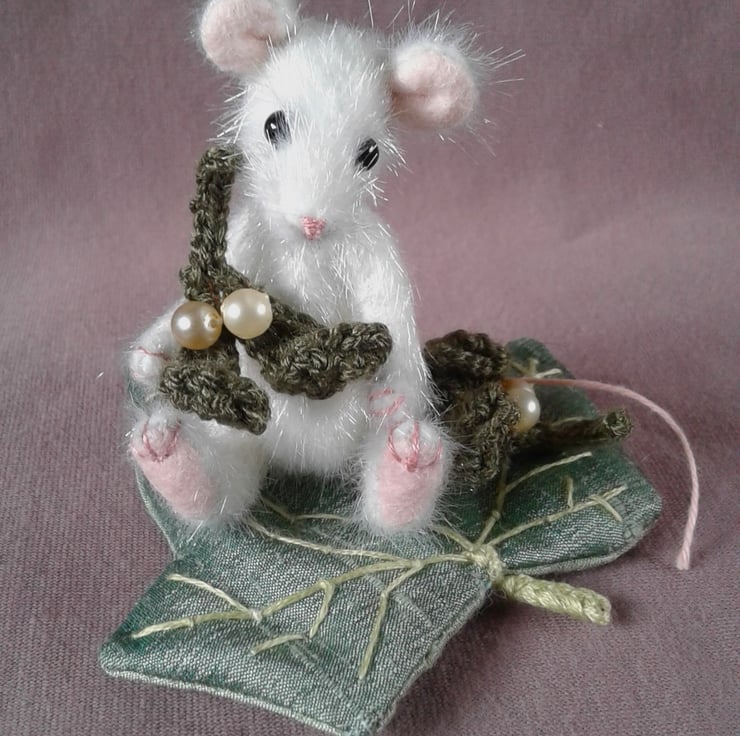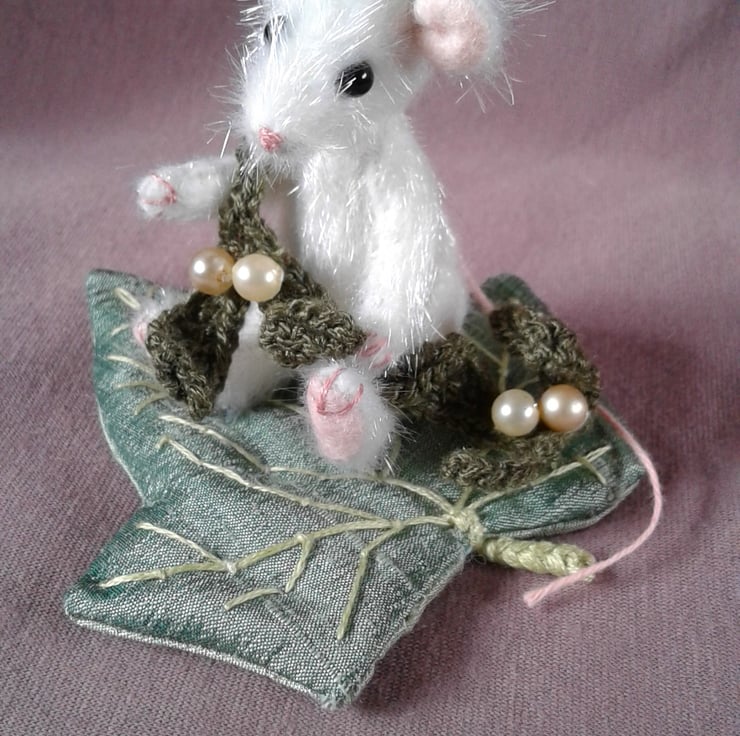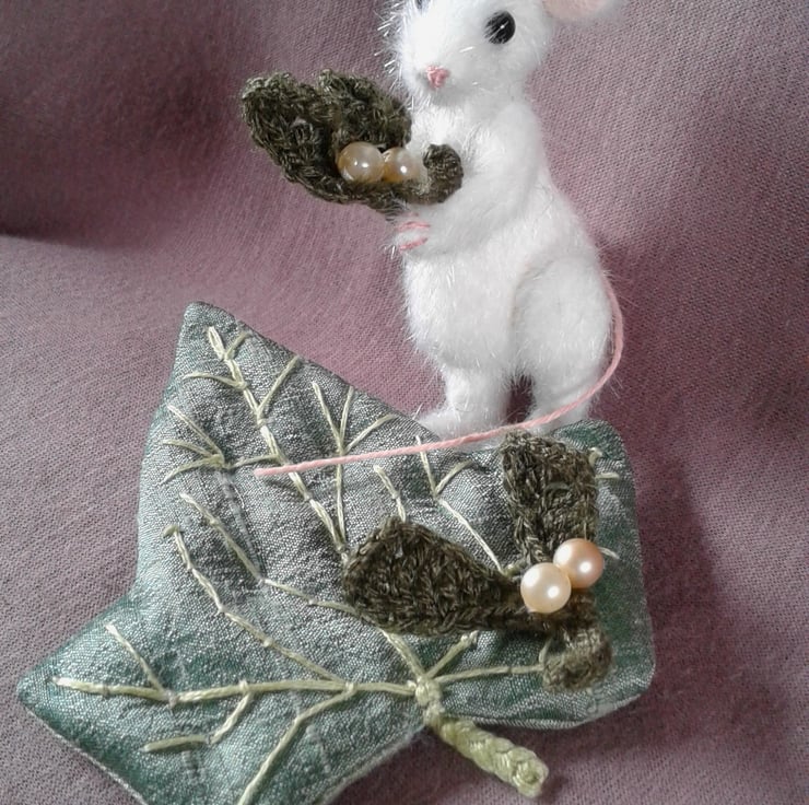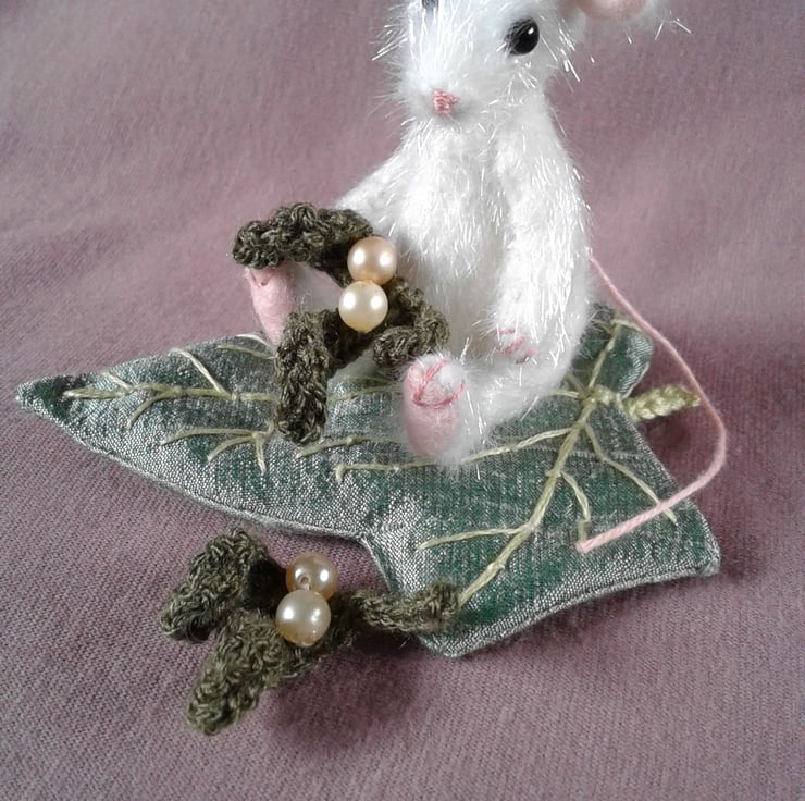 She is perfectly happy just on her own but at Christmas how nice to sit on a silk, embroidered Ivy leaf and have some crocheted Mistletoe with bead berries.