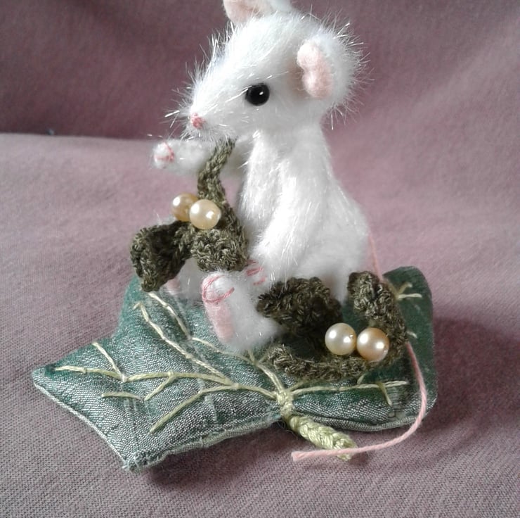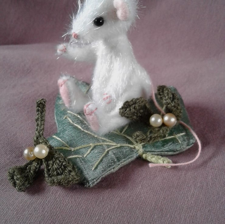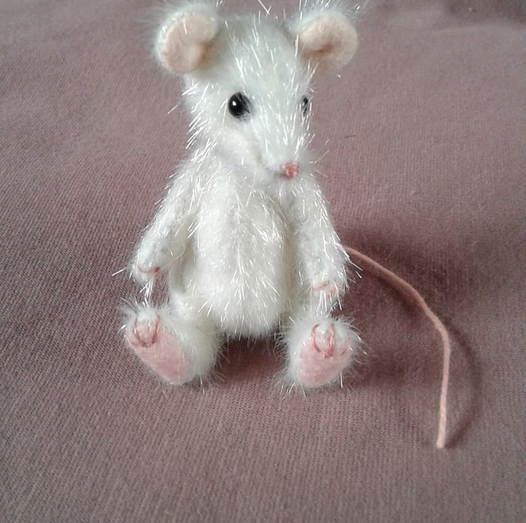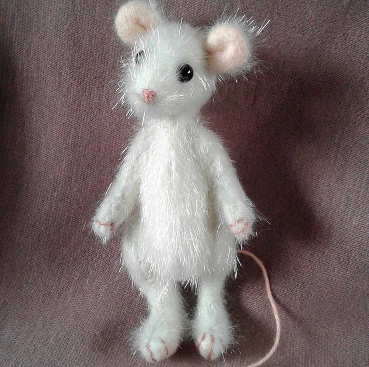 Snowball mouse is only 3" tall yet made as any larger stuffed animal with separately hand stitched parts thread jointed together so fully posable. She is made from beautiful mini bear fur fabric with felt paw pads and ear linings, embroidered claws and nose and tiny Onyx eyes stitched in to sculpt her face.