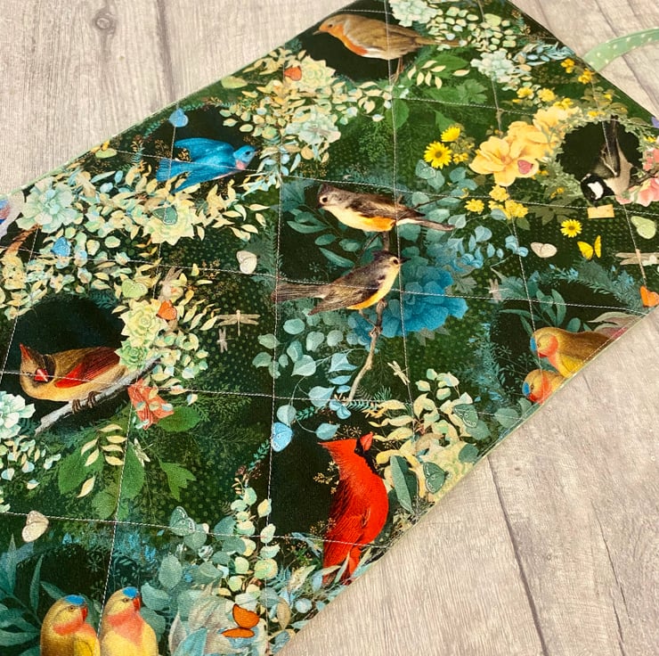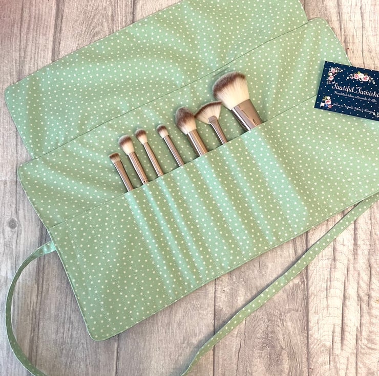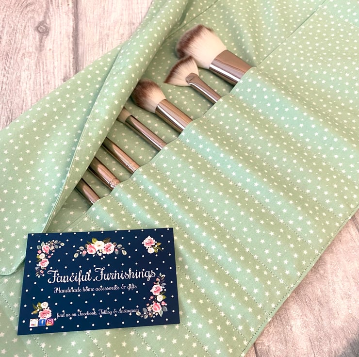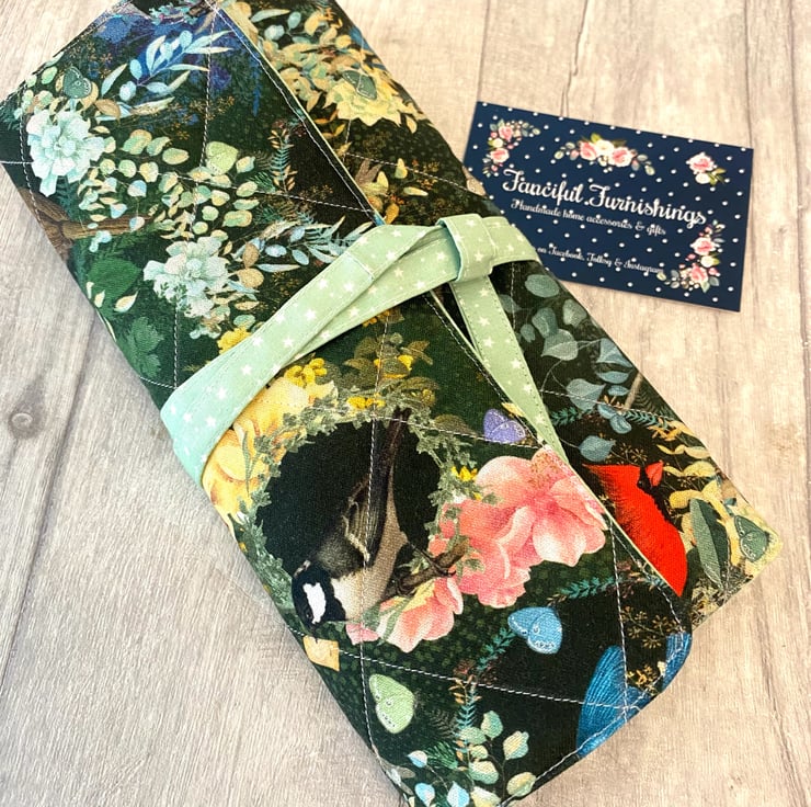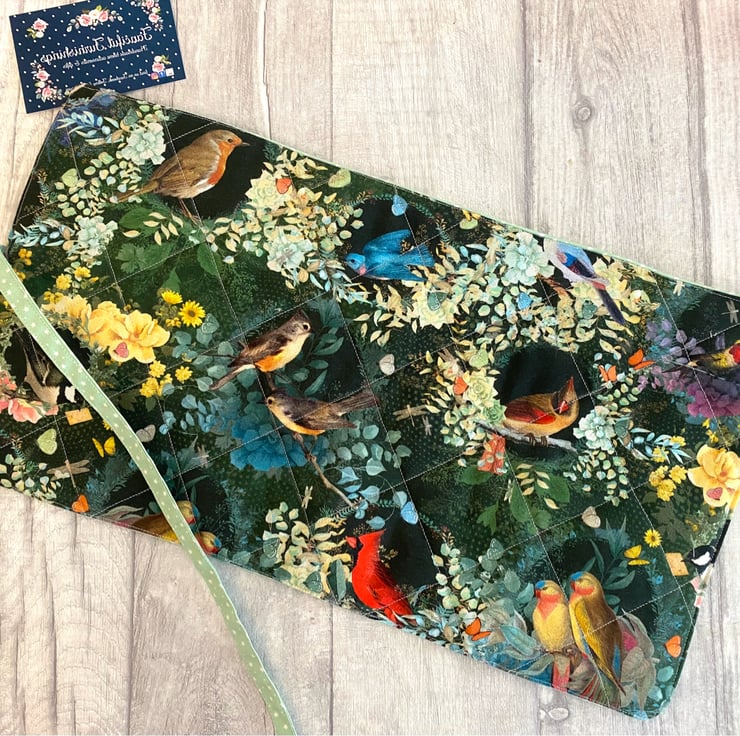 Beautiful cosmetic brush roll. The outer fabric is a beautiful bird design which I’ve quilted and I’ve added this coordinating mint green with tiny stars for the lining, flap and strap. Lots of room for all your brushes, with 14 slots of varying sizes. Measures approximately 36cm x 20cm. Perfect for use at home or if you’re travelling. I think these would make lovely gifts.