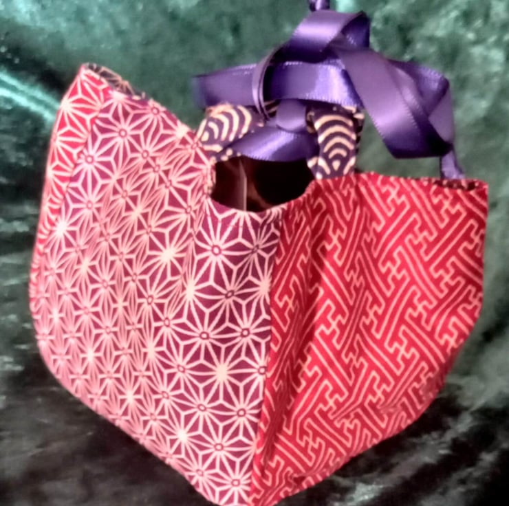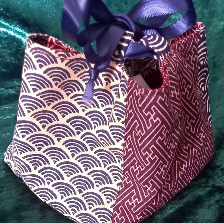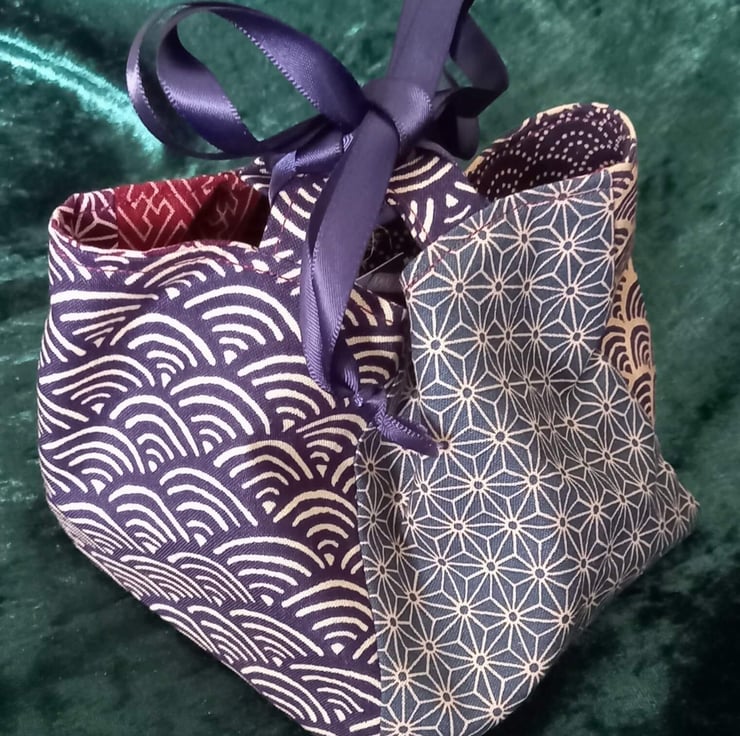 Beautiful Japanese Rice Bag (Komebukuro) in fantastic Japanese printed fabric with a navy satin ribbon tie. The fabric panels feature sashiko style prints in navy, blue, purple and brick red. This bag is also reversible and can be used for many purposes. We like to use ours as storage or as gift bags for the special people in our lives.