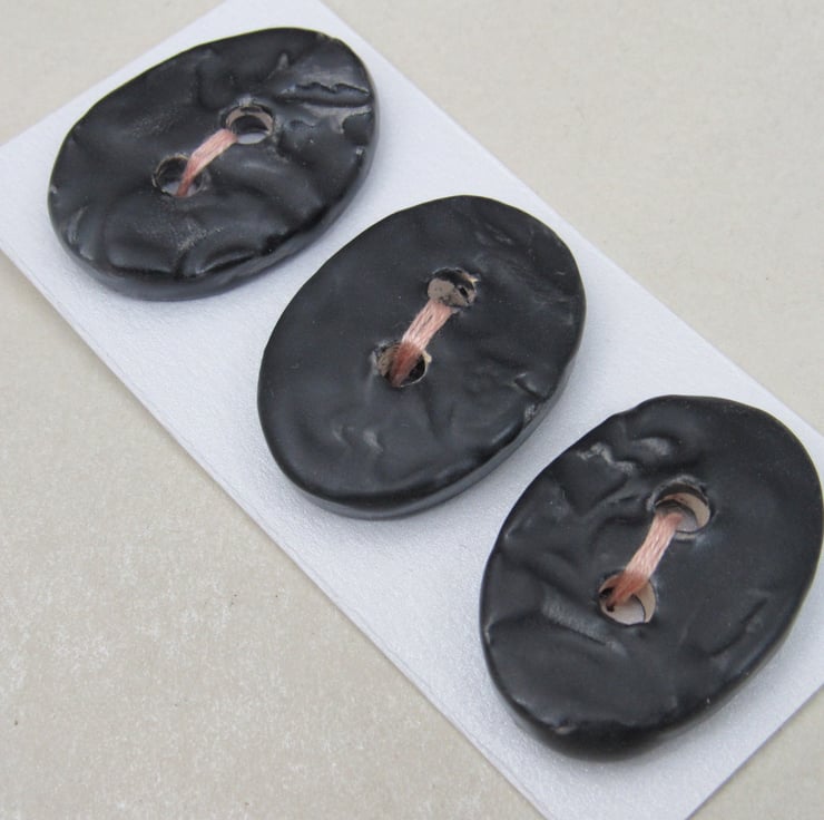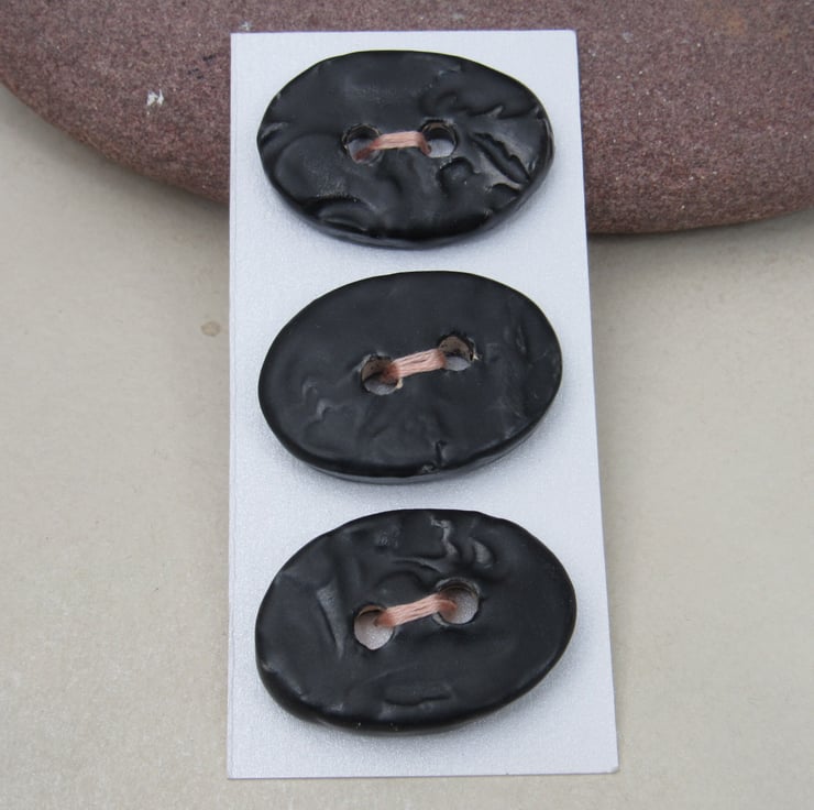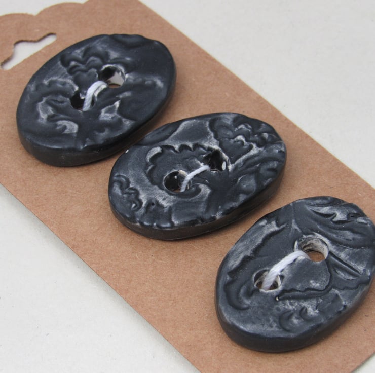 3 medium sized stoneware buttons, with a pretty brocade motif printed into the upper face. Finished with a matte coal black glaze.