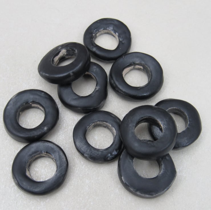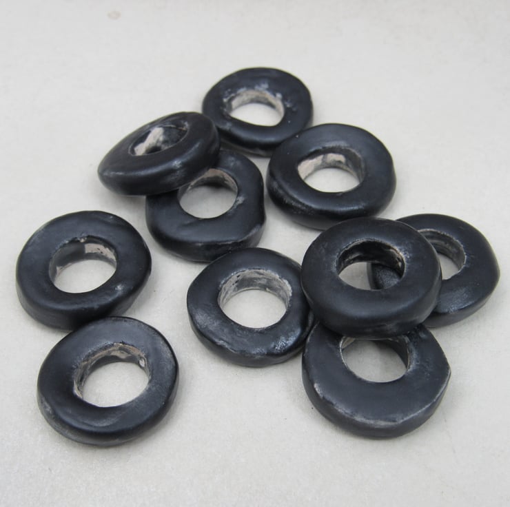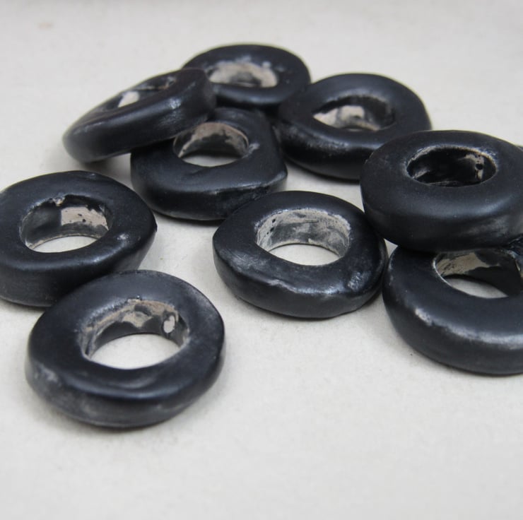 They are approx 1.8 cms (0.7") diameter, with a 9mm (0.3") hole but as they are handmade, they are not identical and not perfectly round.
