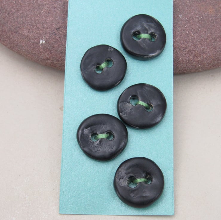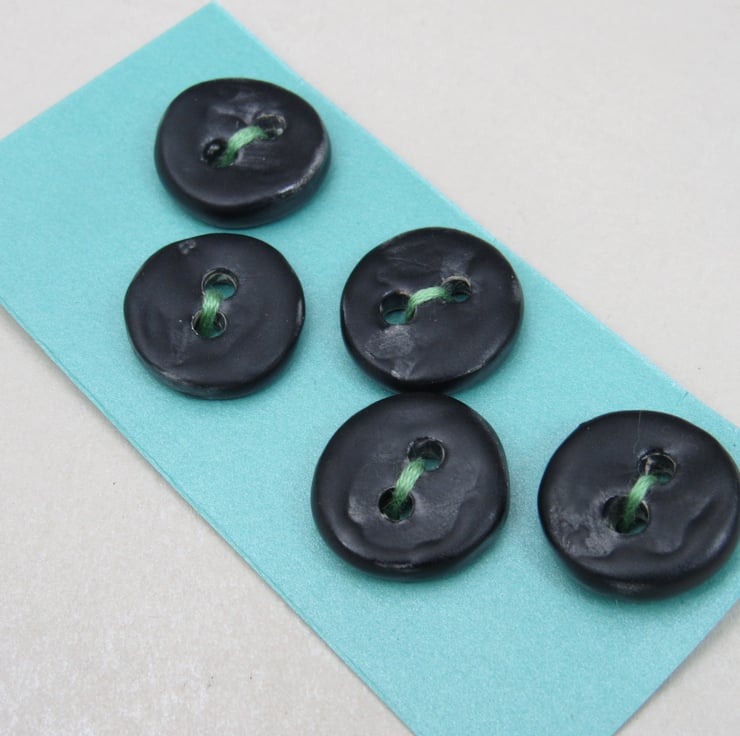 5 small stoneware buttons finished with a matte coal black glaze.