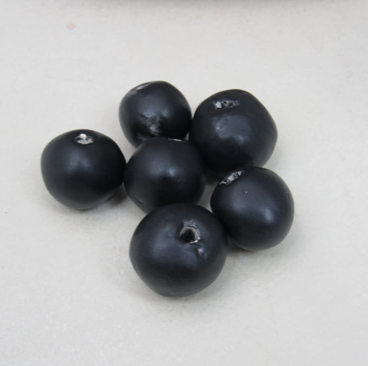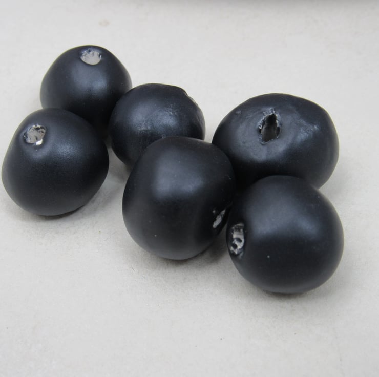 A mixture of handrolled ceramic beads, finished with a matte coal black glaze.