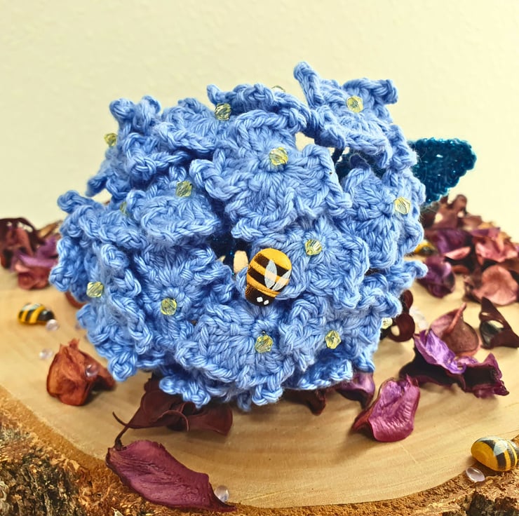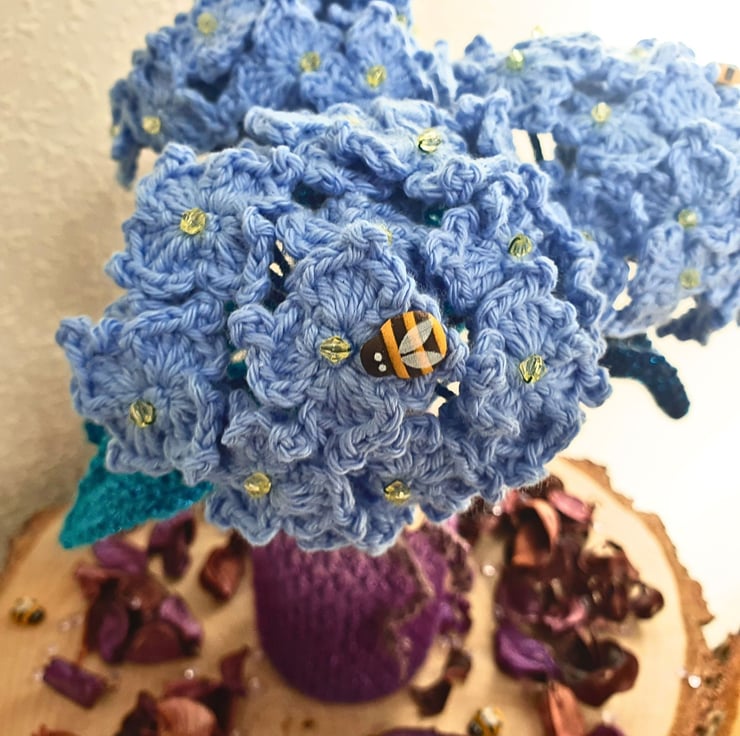 Each stem is made with 20 hydrangea flowers & 2 leaves, all individually hand crocheted with 100% cotton yarn in sky blue & have a yellow bead in the centre. 1 wooden bee on each stem. The leaves are in dark green-blue-turquoise shades, made with premium acrylic yarn, that has a thin strand of fine glittery thread in matching tone.