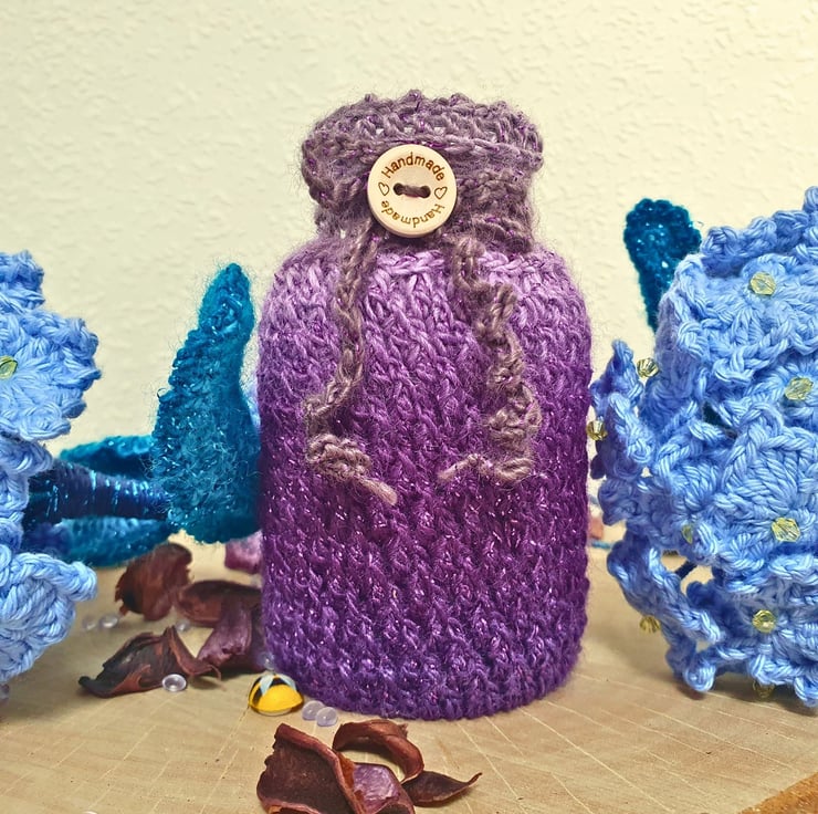 The composition is completed with a glass vase, which is enveloped in a crochet cosy, made with premium acrylic, self-patterned yarn with a strand of fine glittery thread. It is in purple shades. 10cm tall - 6cm wide & decorated with a wooden button.