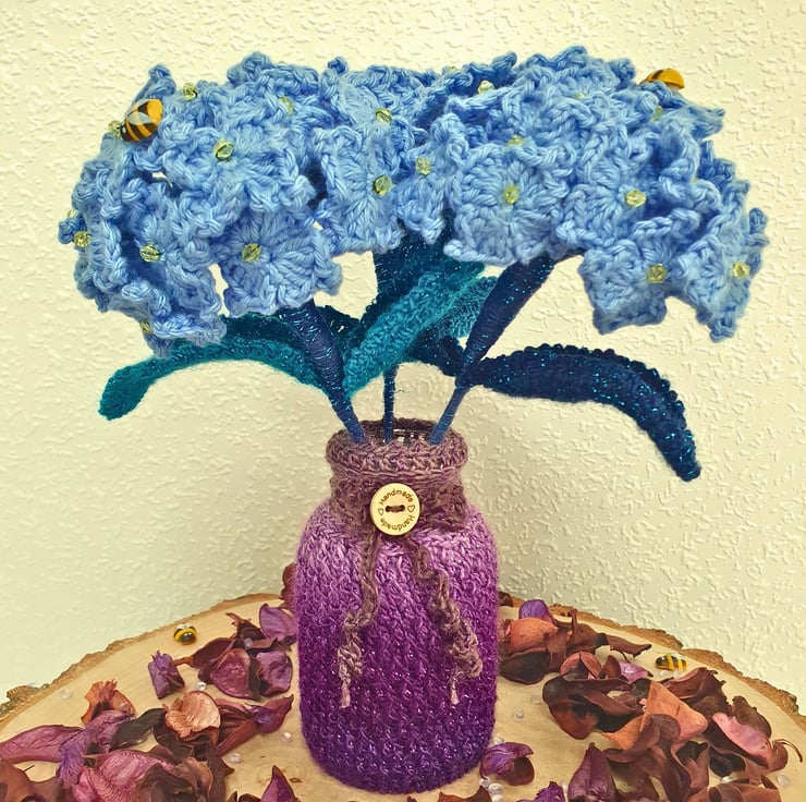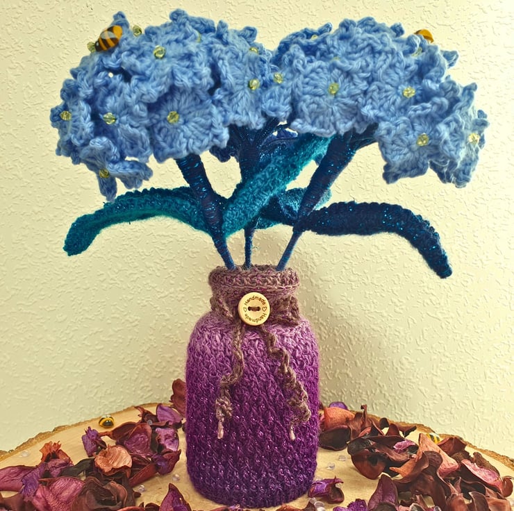 A beautiful composition of crochet Hydrangea flower bouquet & a glass pot enveloped in a crochet cosy.