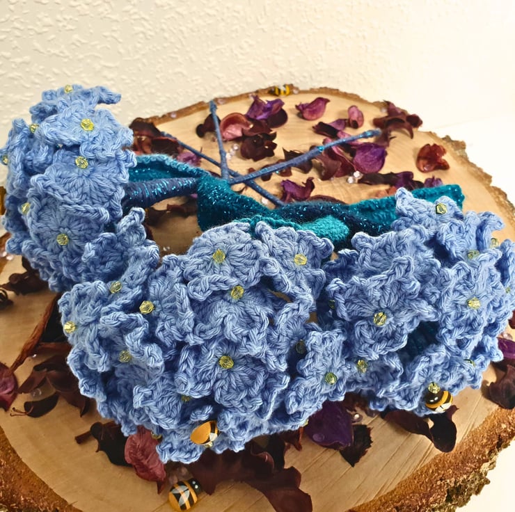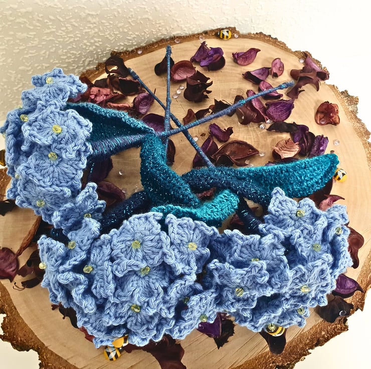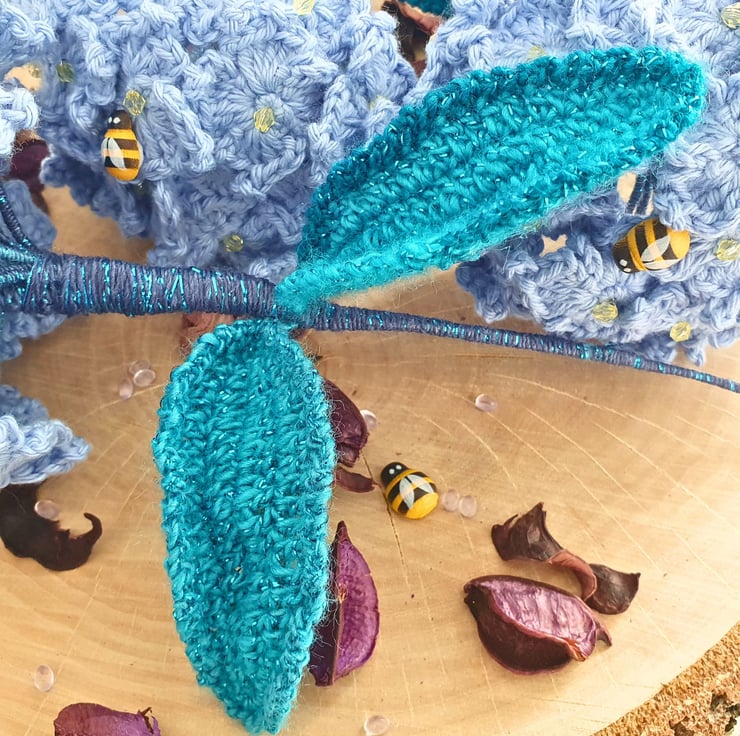 Each stem is made with 20 hydrangea flowers & 2 leaves, all individually hand crocheted with 100% cotton yarn in sky blue & have a yellow bead in the centre. 1 wooden bee on each stem. The leaves are in dark green-blue-turquoise shades, made with premium acrylic yarn, that has a thin strand of fine glittery thread in matching tone.
