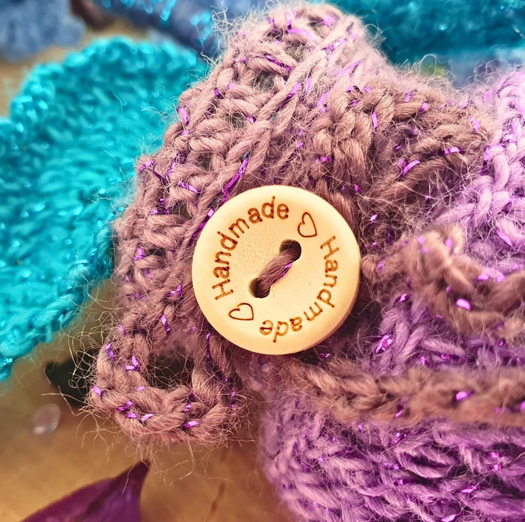 The composition is completed with a glass vase, which is enveloped in a crochet cosy, made with premium acrylic, self-patterned yarn with a strand of fine glittery thread. It is in purple shades. 10cm tall - 6cm wide & decorated with a wooden button.