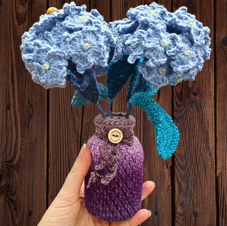 A beautiful composition of crochet Hydrangea flower bouquet & a glass pot enveloped in a crochet cosy.