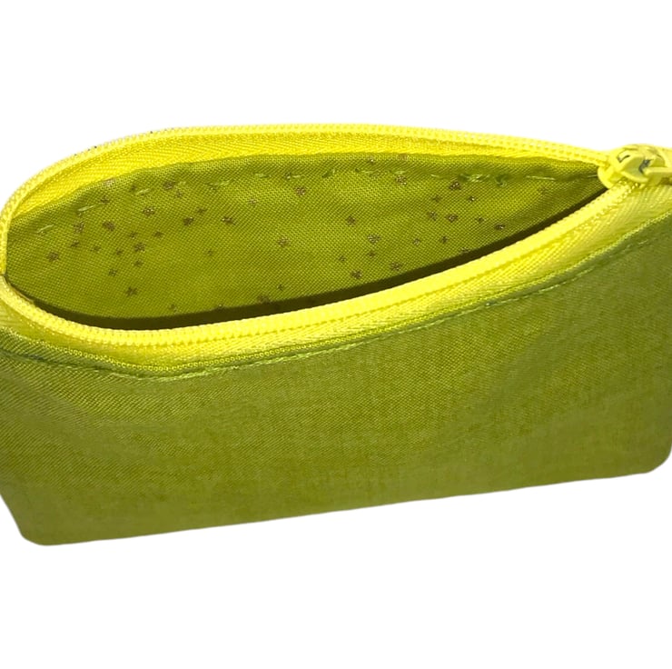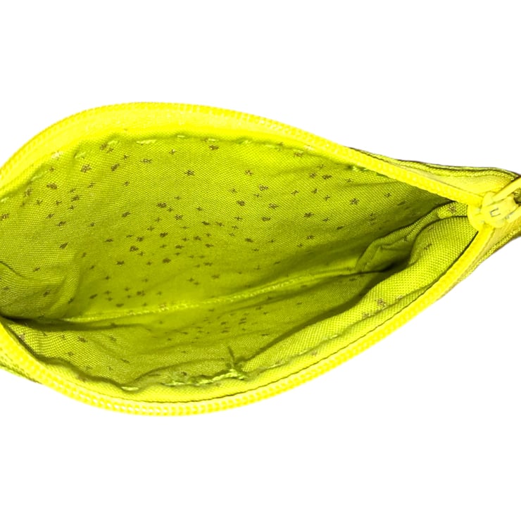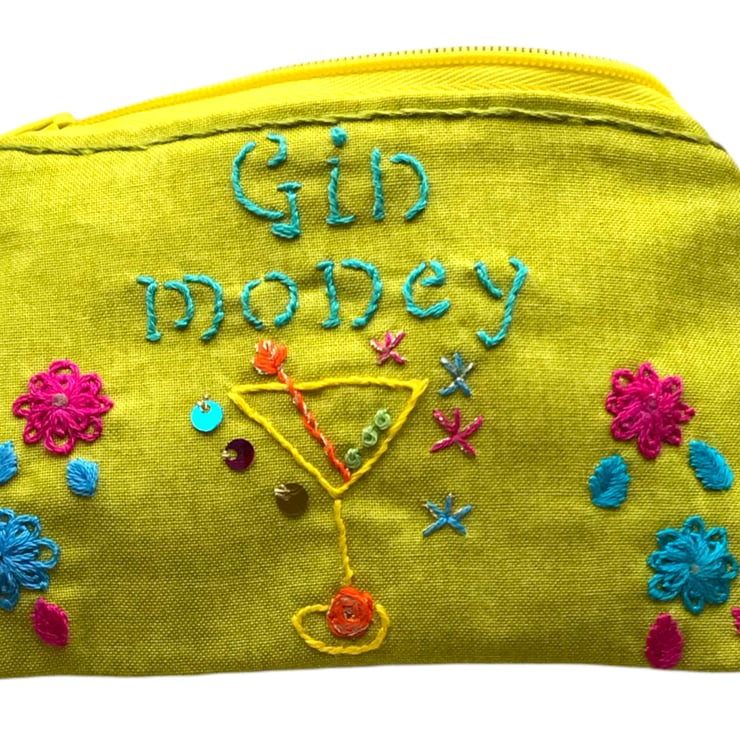 This is a hand embroidered coin purse made from linen look cotton. It is fully lined with a zip fastening. It is decorated with some sequins to add a bit of sparkle.