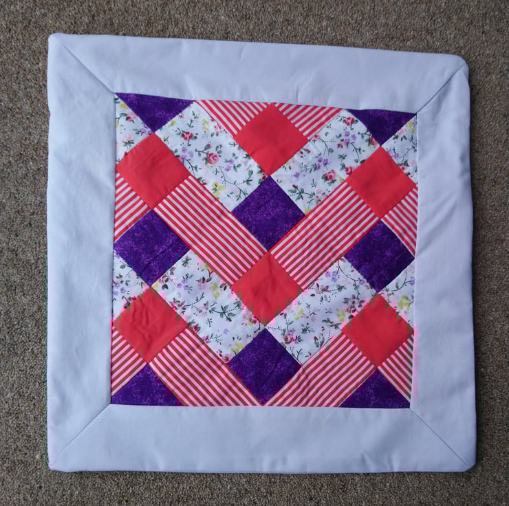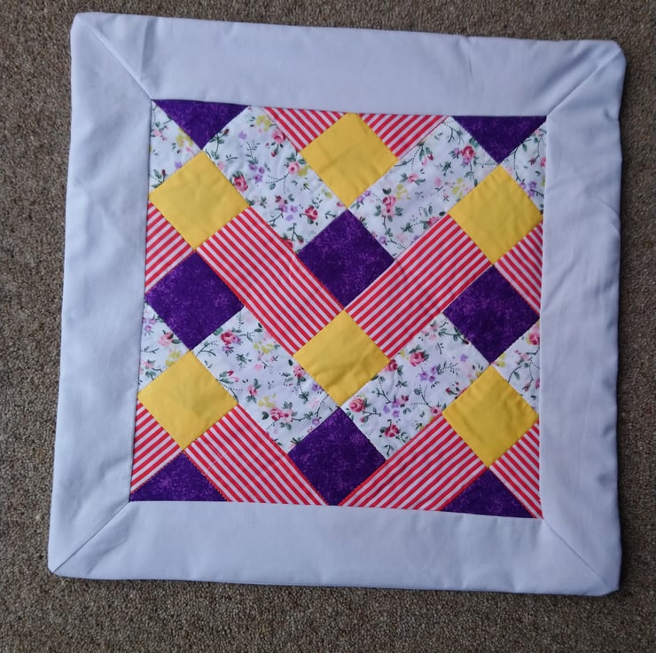 These cushion covers are made with handsewn patchwork in lovely bright colours. Each one has patches in a red stripe, floral pattern, and deep purple, but then there is a choice - either red, yellow or pale mauve for the other squares. The border and backing on all the covers is in a plain pale mauve. Wrapover back for insertion of pad (not included).