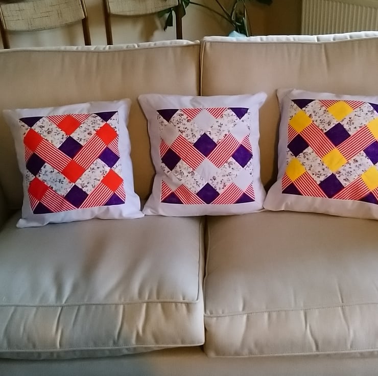 Patchwork cushion covers in red, yellow and purple. Three  available.