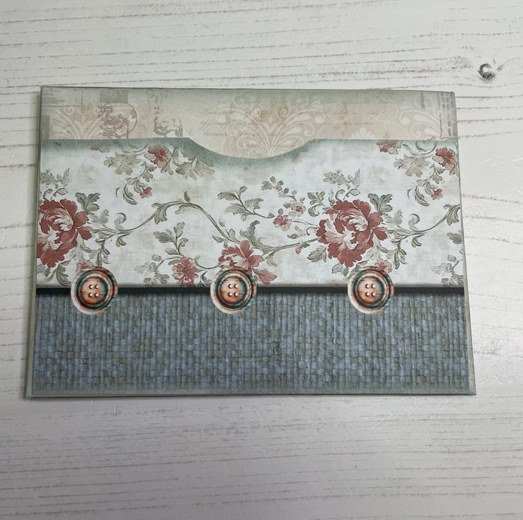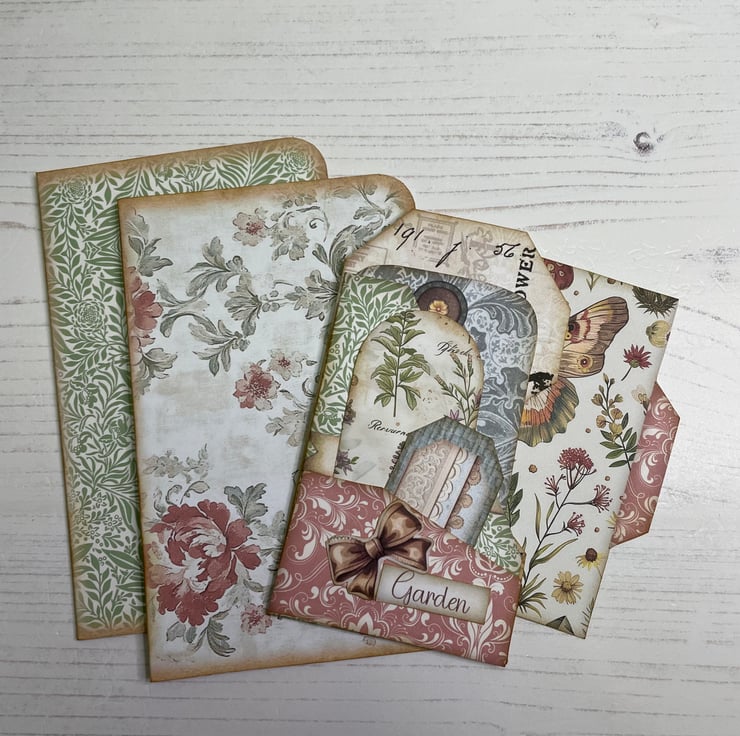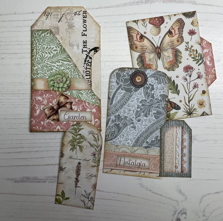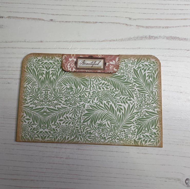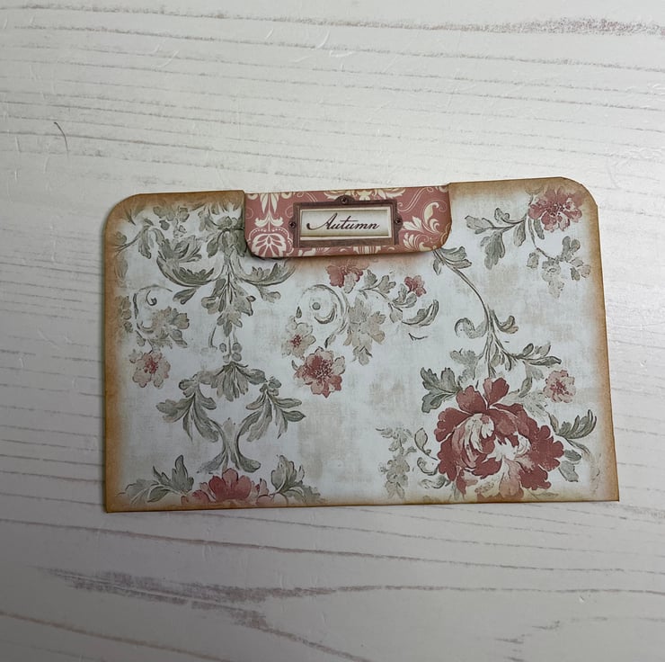 Blues, greens and a hint of pink made into a delightful ephemera set. Presented in an envelope with a back pocket. 2 mini file folders with tabs. Pocket folder holding 2 tags. Measures envelope 5.25” x 3.75”. File folders 5” x 3.25”. Picket folder 4.5” x 2.5”.