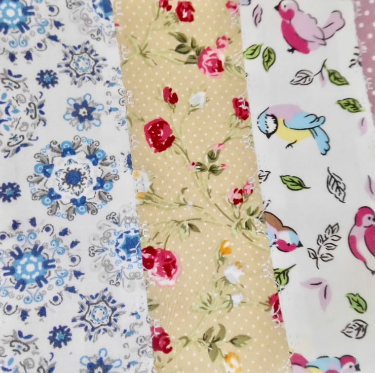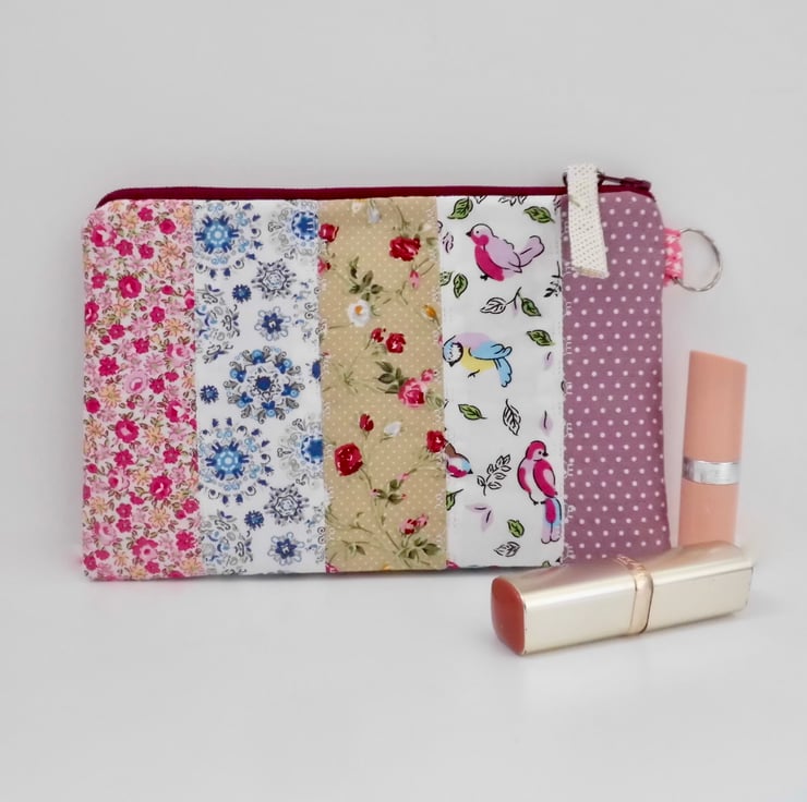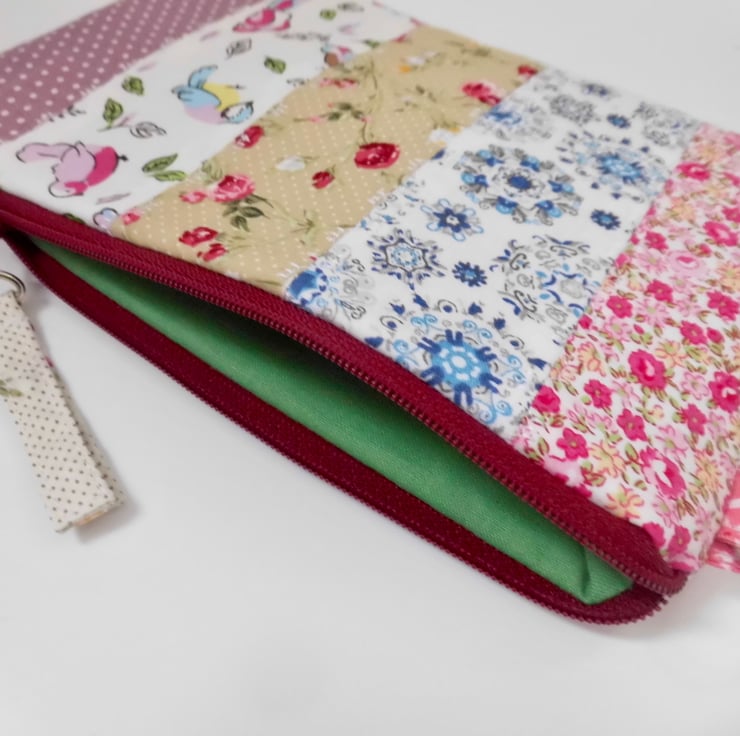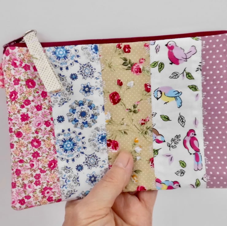 I made this zipped purse using a variety of colourful quilting cottons left over from other projects. I cut them into strips, stitched them together and then backed this fabric with fusible fleece. I topstitched the four seams on each side with antique quilt stitch to give a lightly quilted effect. It is lined with plain green cotton.