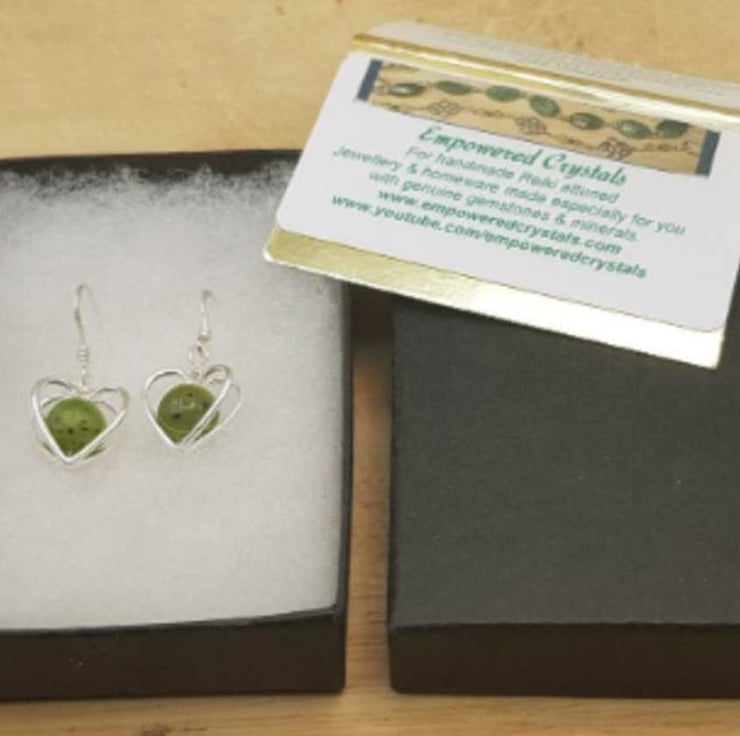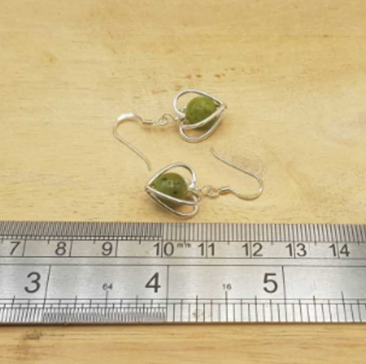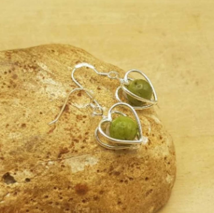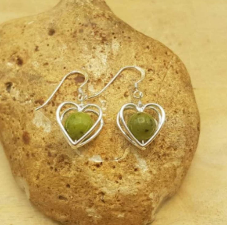 This is a women's small minimalist sterling silver green nephrite jade earrings with silver 3D heart frames. Perfect for a minimalist jewellery gift. Stones will vary from the photos.