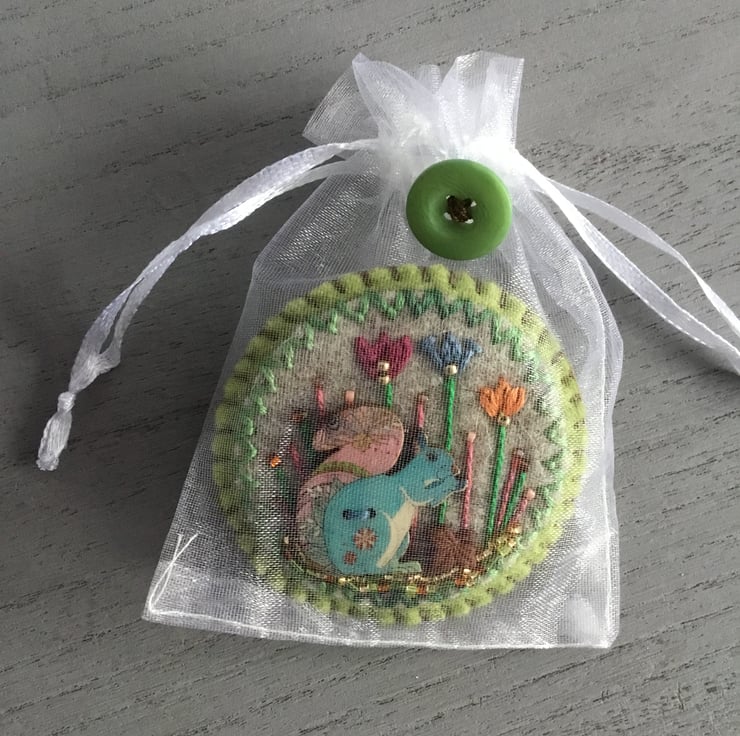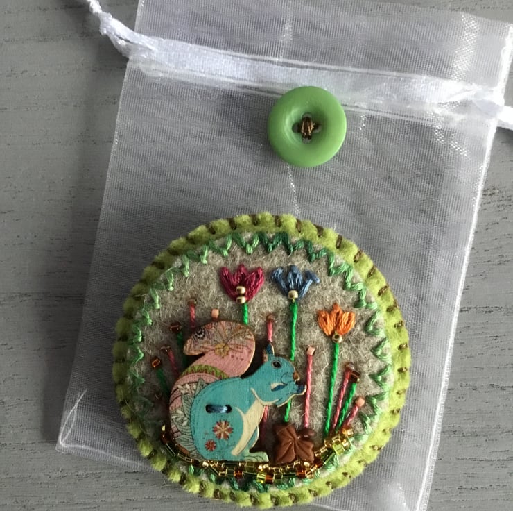 This Hand Embroidered Squirrel Brooch is gift wrapped in an organza bag, decorated with a button. It’s ready as a birthday, friendship, thank you gift…..or to treat yourself. An ideal gift for Squirrel or nature lovers…… It’s light to post, making a good letterbox gift.