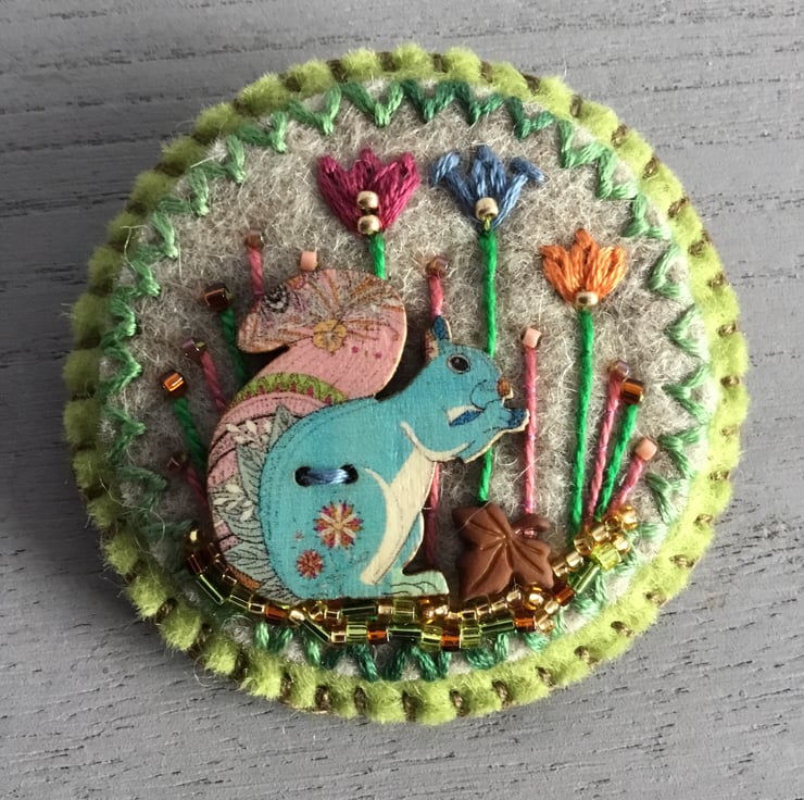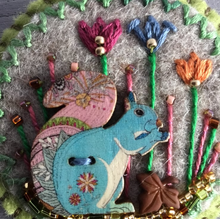 This Hand Embroidered Squirrel Brooch with its nature scene, has a lovely decorative Squirrel button stitched onto circles of beige and green felt, edged in Fly and Blanket Stitches in shades of green and brown colours. This lovely Squirrel sits in hand embroidered flowers and a leaf button, decorated with green, golden and brown seed and bugle beads.