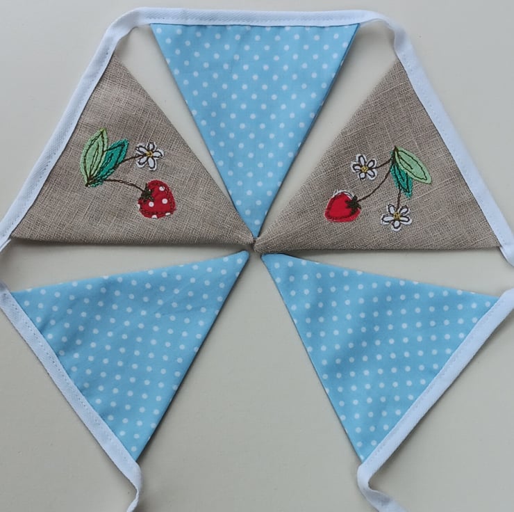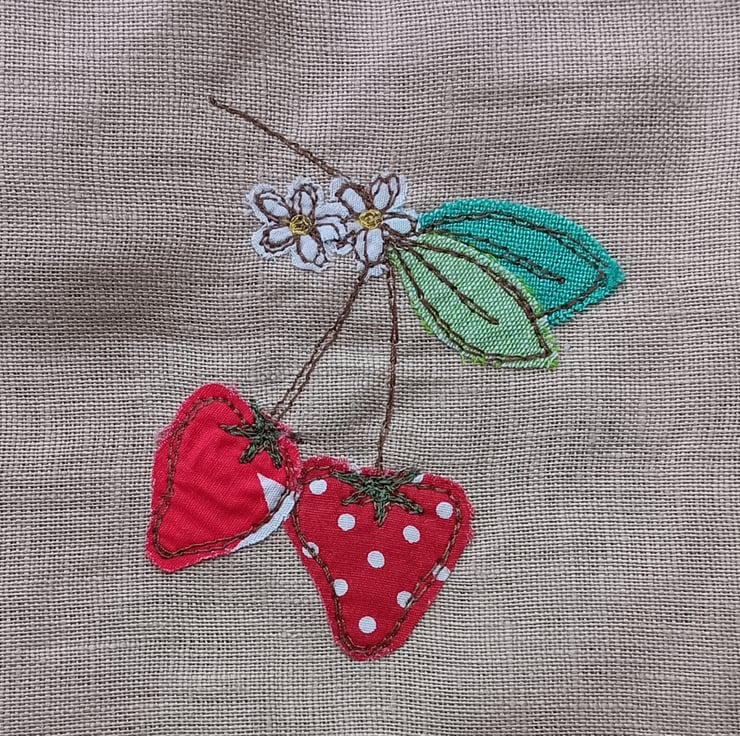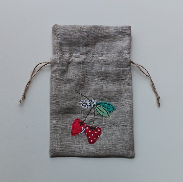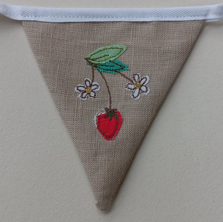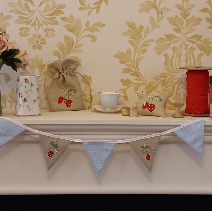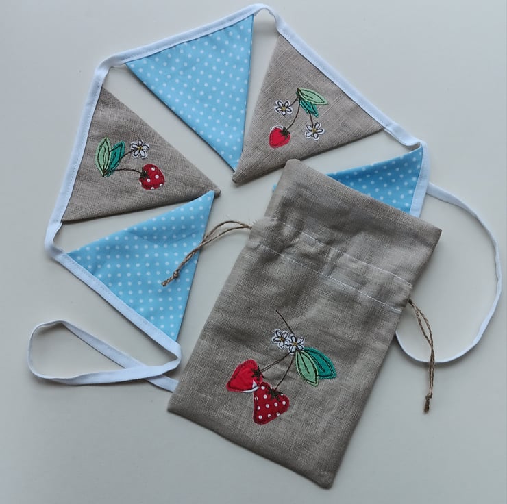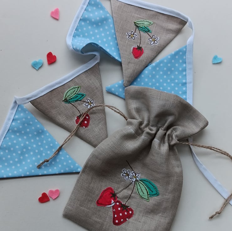 Brighten up your home with this delightful summery mini bunting, featuring embroidered strawberries. The design is made by appliqueing tiny snippets of fabric onto beige linen and sewing them using free motion embroidery. Perfect for parties, picnics or simply adding a touch of whimsy to your home decor, these flags would also make a perfect new home gift as they come with their own drawstring gift bag. The bag is made from linen and has a similar strawberry design embroidered on it.