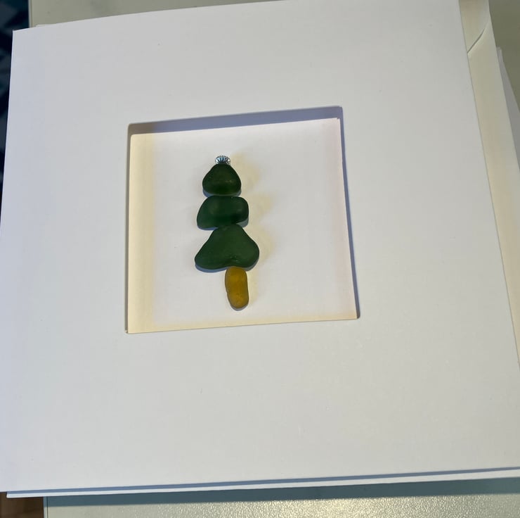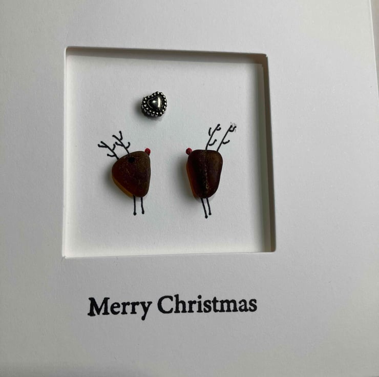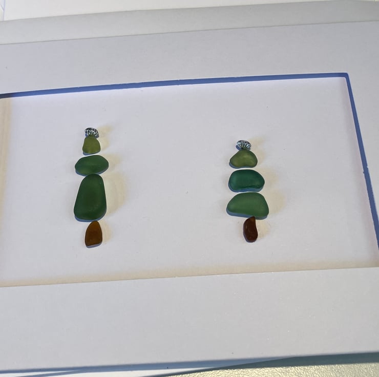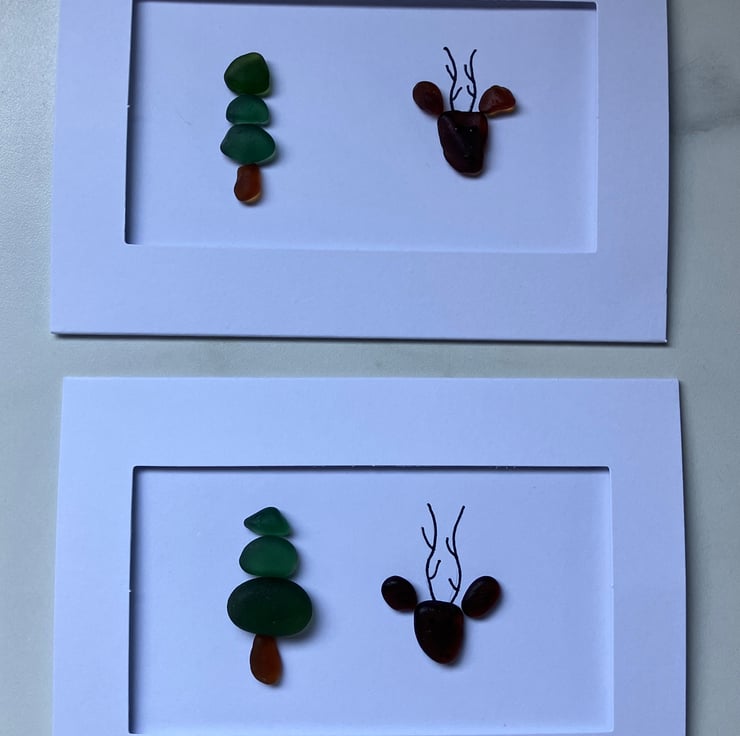 Christmas trees with sparkly metal topper. Or Christmas tree with reindeer. Blank for your own message, or can add ‘Happy Christmas’ with ink stamp. Quality white card and envelope - size 13x13cm (5x5”)