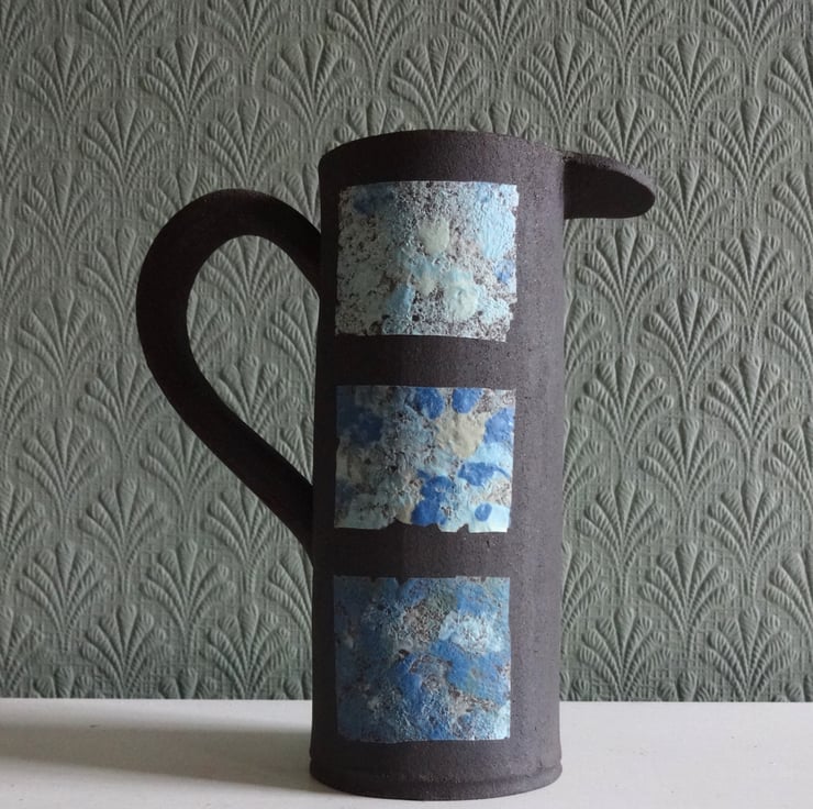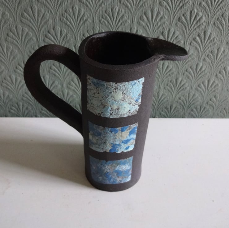 This colourful jug will brighten up your living space with its sea and sky themed colour block design in blues and greens and and its jaunty beaky spout shape. Handmade from black stoneware clay, it’s perfect for an unusual gift, or to hold a few buds and blooms in your home. I decorated the outside with mingling colour, letting the sea blues and greens flow together. This design is on two sides of the jug, with each square of colour showing different textures and shades. The inside is glazed with a tenmoku finish to give a satin sheen, but I’ve left the outside of the jug the matte finish of the natural clay and coloured slip. It’s not for food use due to the unglazed exterior, but is simply a lovely home art accessory. 14cm high x 4 cm at the widest part of the base. Underneath you’ll find my potter’s seal impressed into the clay before firing.