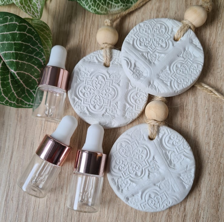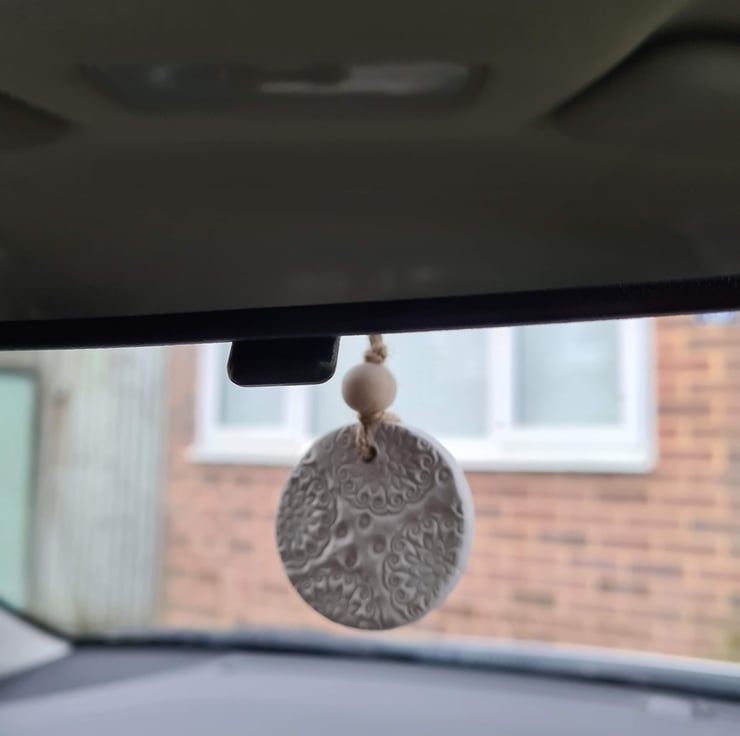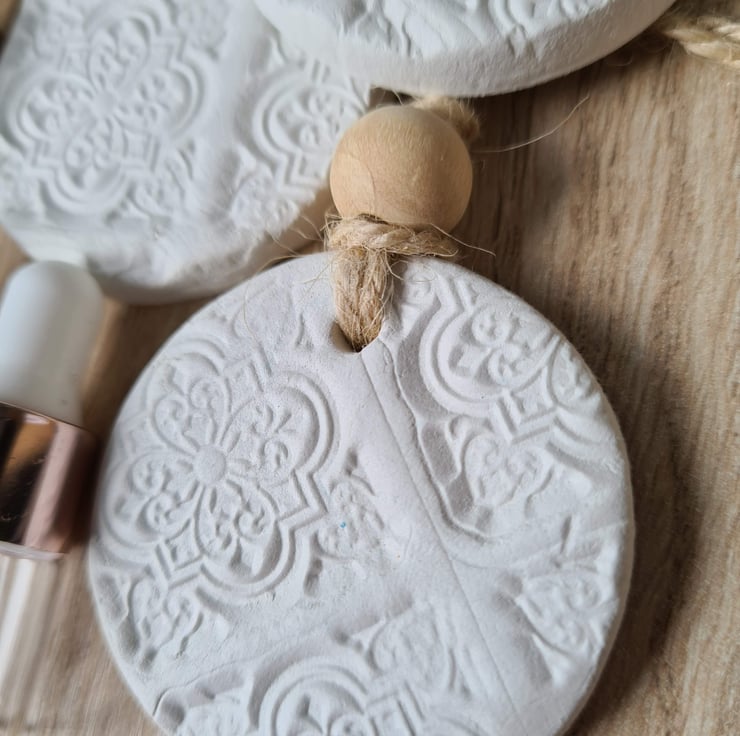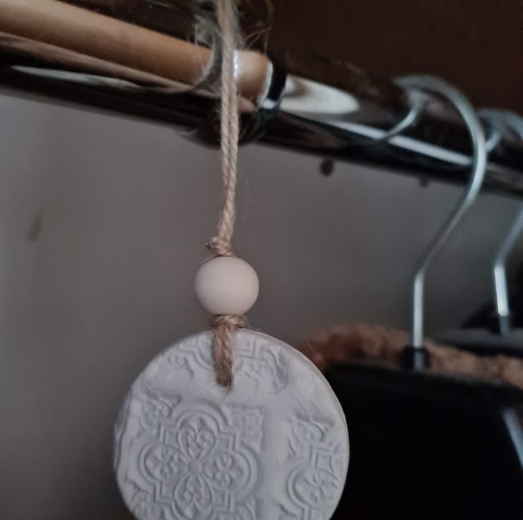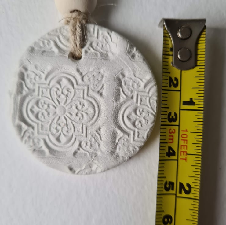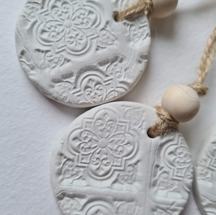 These pretty round hanging decorations are made from air-drying clay, which is unsealed to absorb essential oil. Pattern is on one side, the other side left plain and each measures approx 4x4cm.