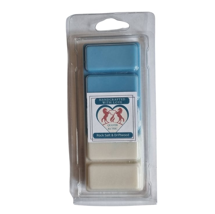 Luxurury highly scented rock salt and driftwood fragranced soy wax melt bars hand poured into clamshells, made with premium quality, responsibly sourced soy wax and a variety of the finest fragrances providing 65 hours of long-lasting home scent.
