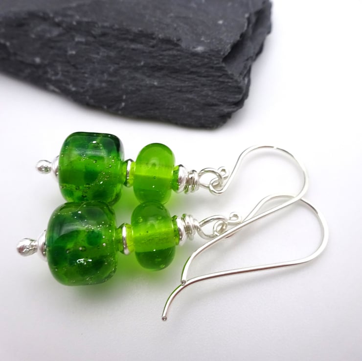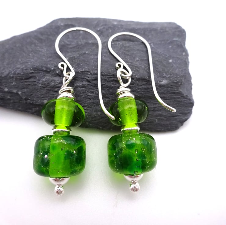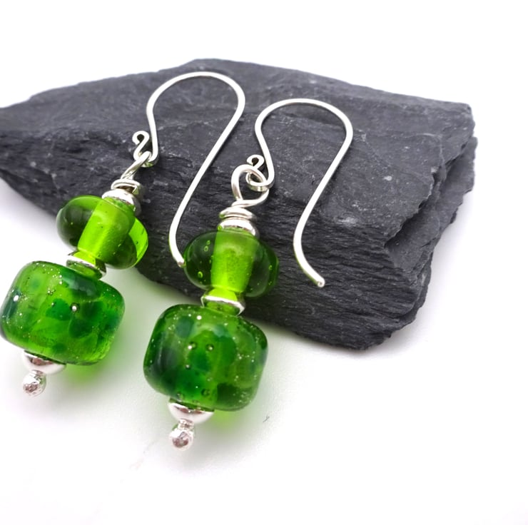 They feature handmade sterling silver ear wires, handmade lampwork green glass beads and sterling silver beads.