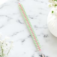 This particular bracelet fits a wrist up to 21.5cm but can be made to fit any size. The metal bars and clasp are a strong and are lead and nickel free.