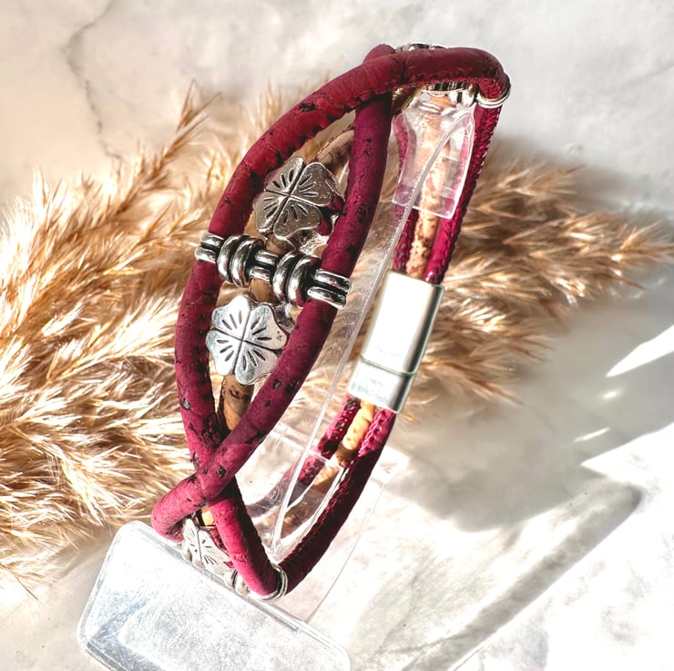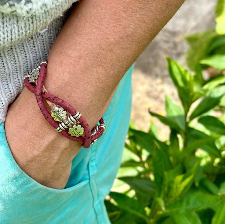 An unusual but elegant lightweight bracelet, made from natural Portuguese cork 'leather' (completely Vegan) and antique silver effect bars and four cute clover leaf silver beads, creating a stunning bracelet that can be worn casually on holiday or works equally well with a dressier outfit.