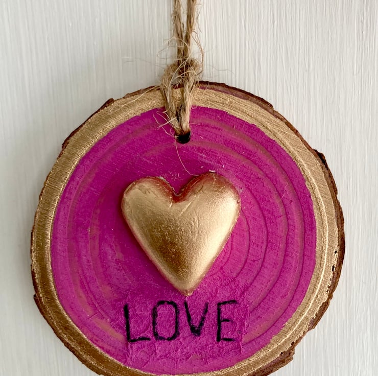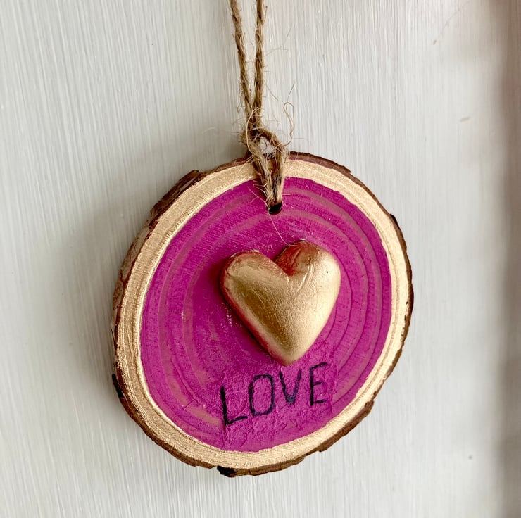 Lovely Wood Slice Hanging Decoration With Gold leaf Clay Heart with the word Love