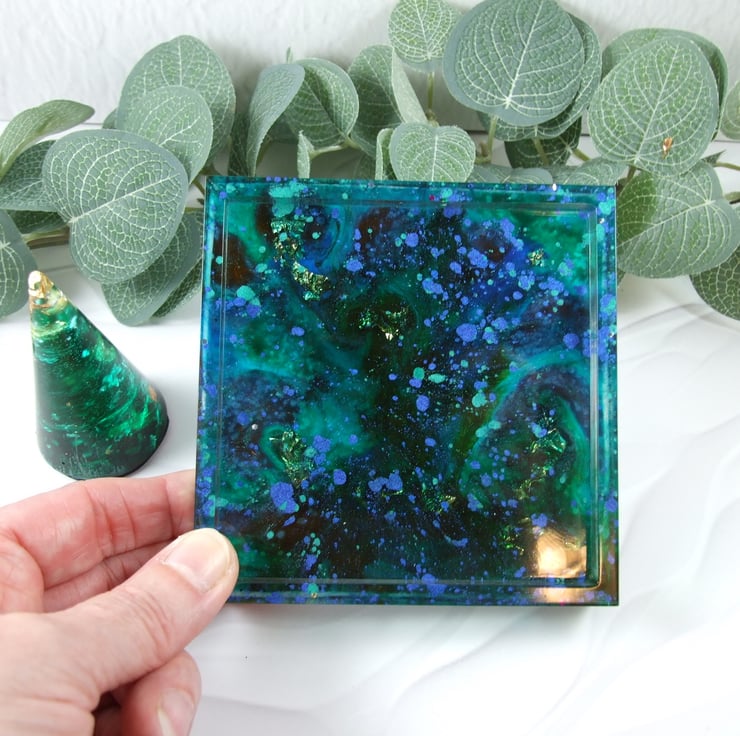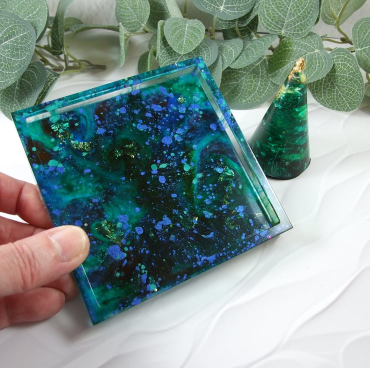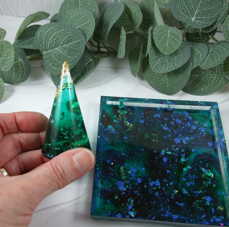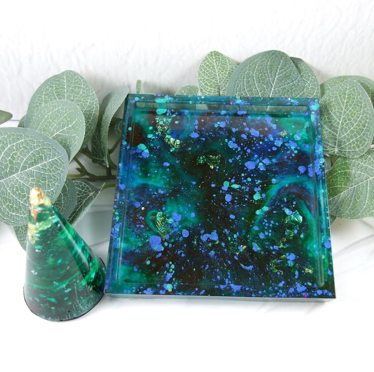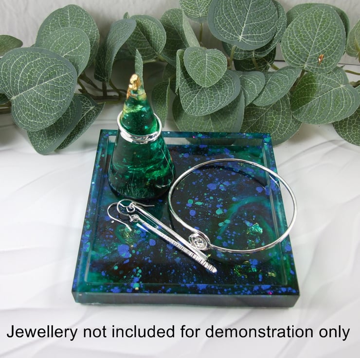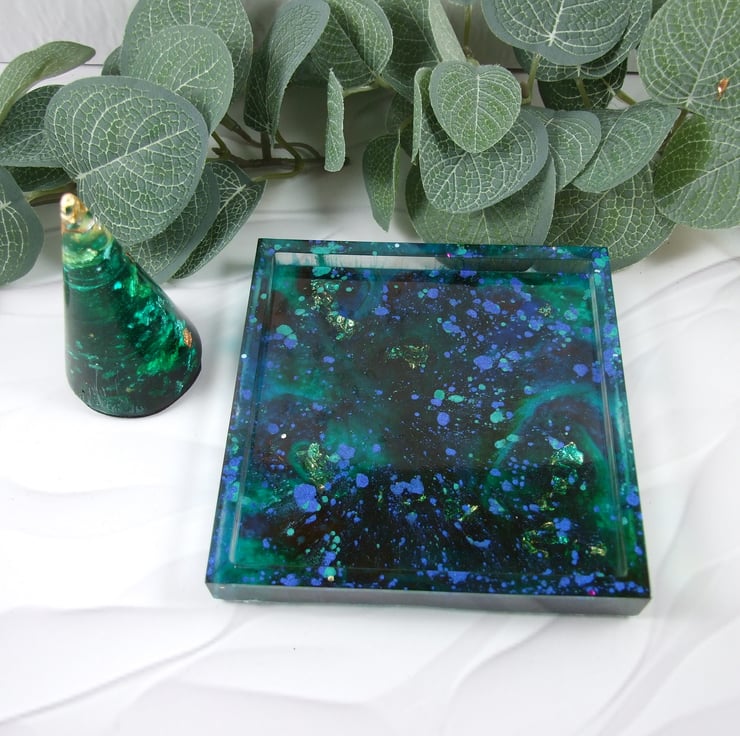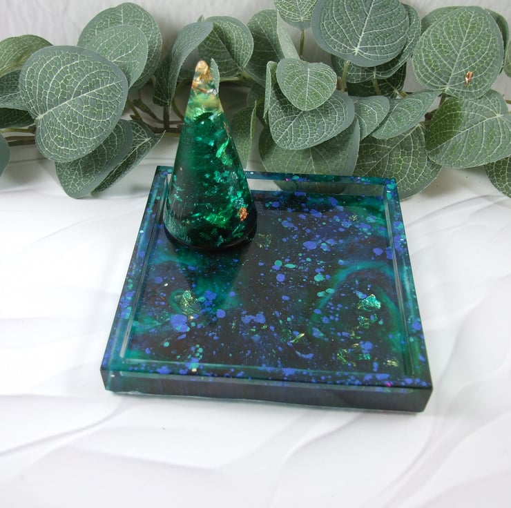 I have used Pebeo Bio-Resin for this creation. Using a mould for both the trinket dish and ring holder. I have layered clear resin with alcohol inks in shades of blue and green with metal leaf to create a unique and handy little dish.