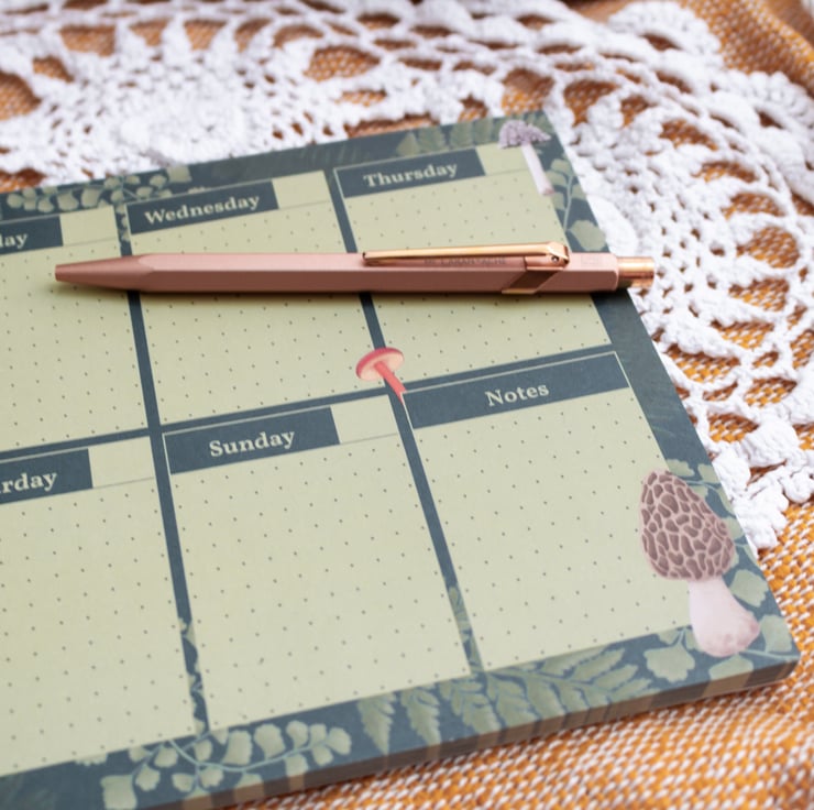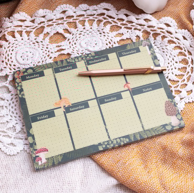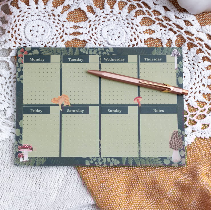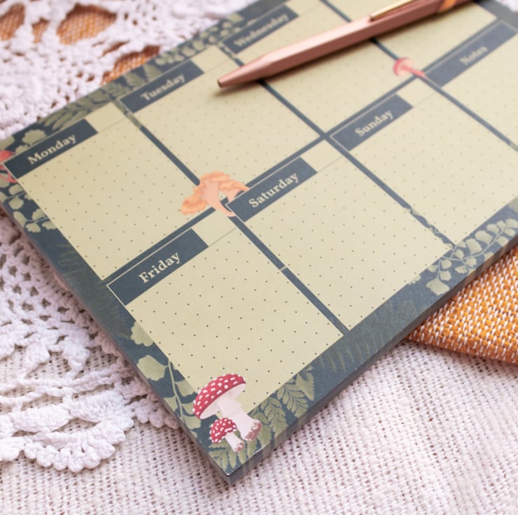 This weekly planner pad with its mushroom and fern design is perfect for organising your week. With 50 tear-away pages of 80gsm recycled paper, this pad is durable and easy to use. It's convenient for on-the-go planning. Say goodbye to boring planners and hello to a fun and practical tool!