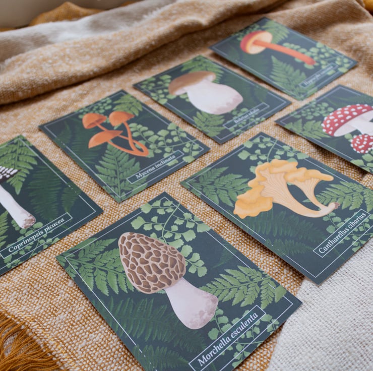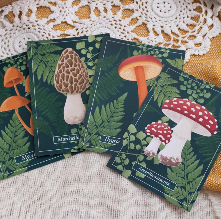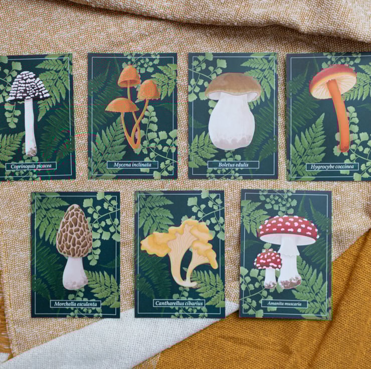 This is the complete set of all our mushroom postcards and contains the following illustrations: Fly Agaric, Chaneterelle, Morel, Penny Bun, Clustered Bonnet, Magpie Inkcap and Scarlet Waxcap.