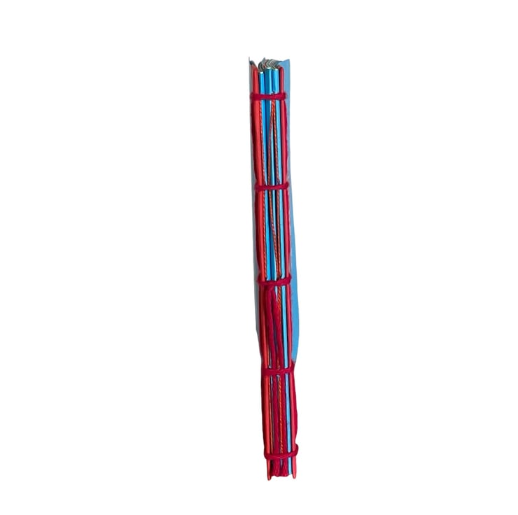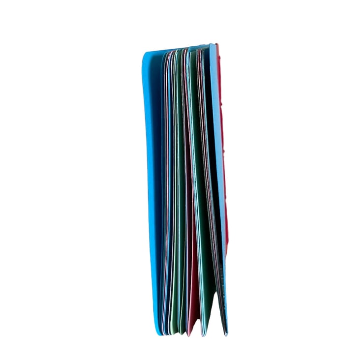 This notebook is hand constructed from a cardboard cover with a collage motif and hand painted detailing. It contains three book blocks of premium coloured paper (blue, pink, green and mauve) which are hand stitched to the spine.