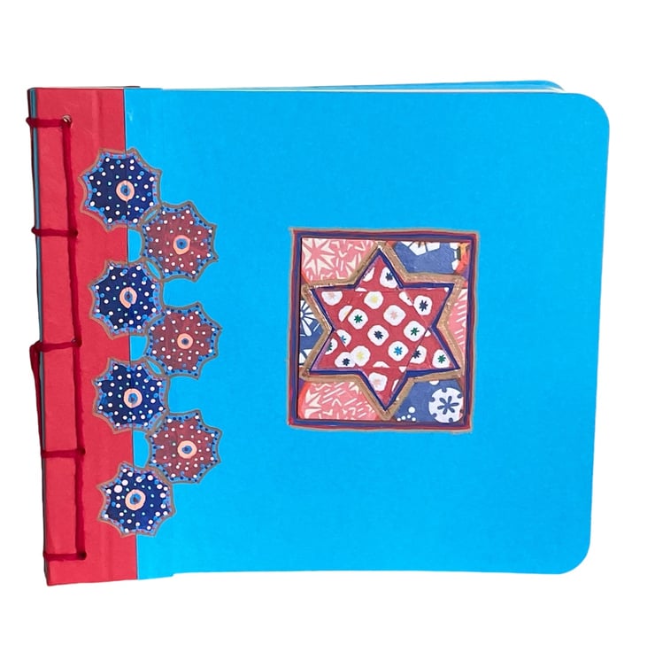 The paper and cover have rounded corners and the cover is decorated with a hand pieced collage motif and hand painted detailing
