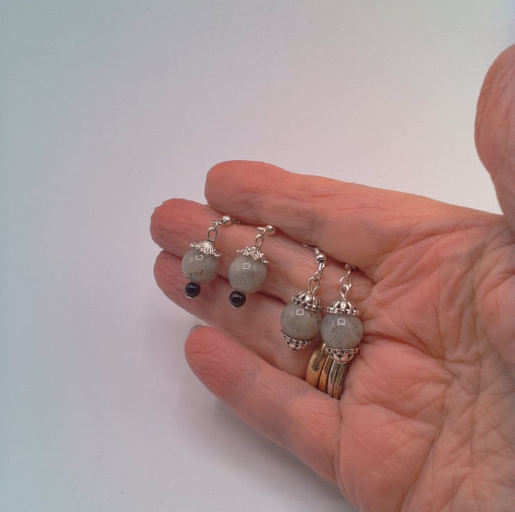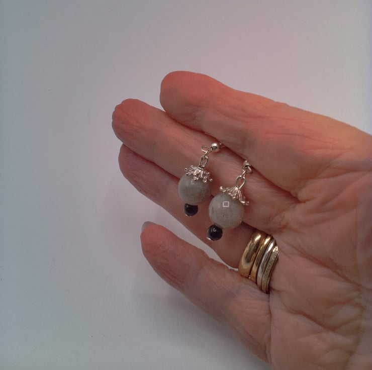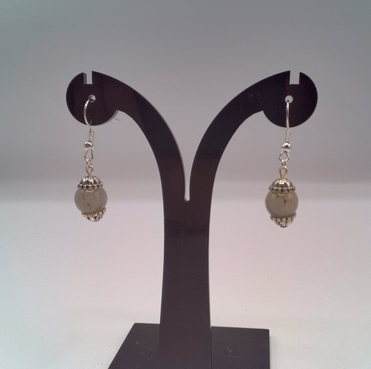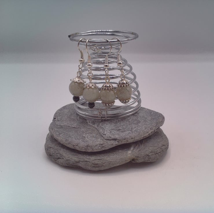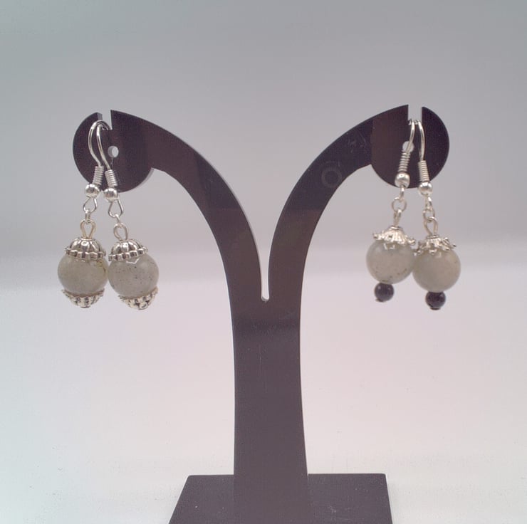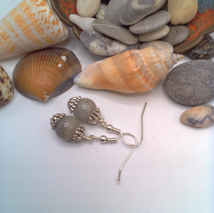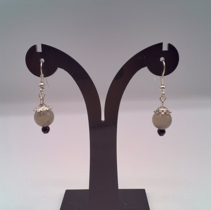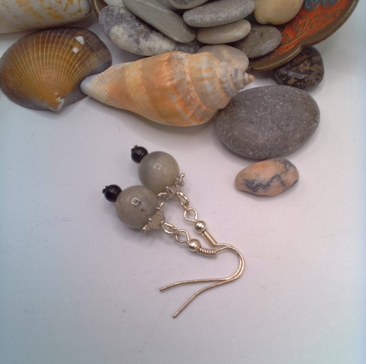 These pretty earrings will put the finishing touches to any outfit you wear everyday for the office or a day or evening out. They would make the lovely gift for a friend or relative for a birthday or anniversary, or a treat for yourself. These pretty earrings are made using 10 mm charcoal gray agate beads, silver bead caps and 3 mm black glass beads. They are suspended on silver plated ear wires and they have a drop of 2 cm.