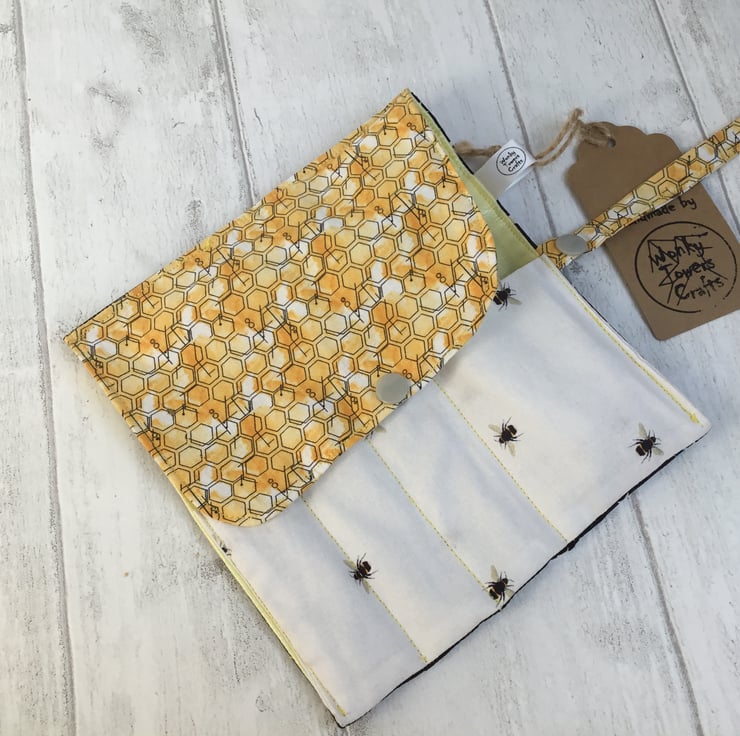 If you are looking for a different present for someone, this fits the bill. We have various designs and fabric choices, to suit men, women and children and postage can be combined on multiple items. This listing is for a black and yellow rolls, featuring bees and honeycomb. Other designs are listed separately.