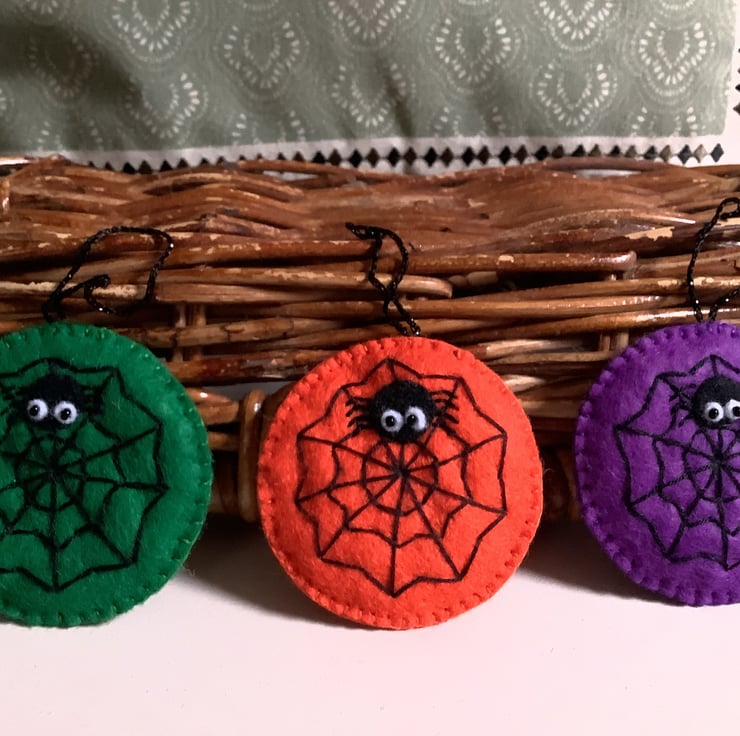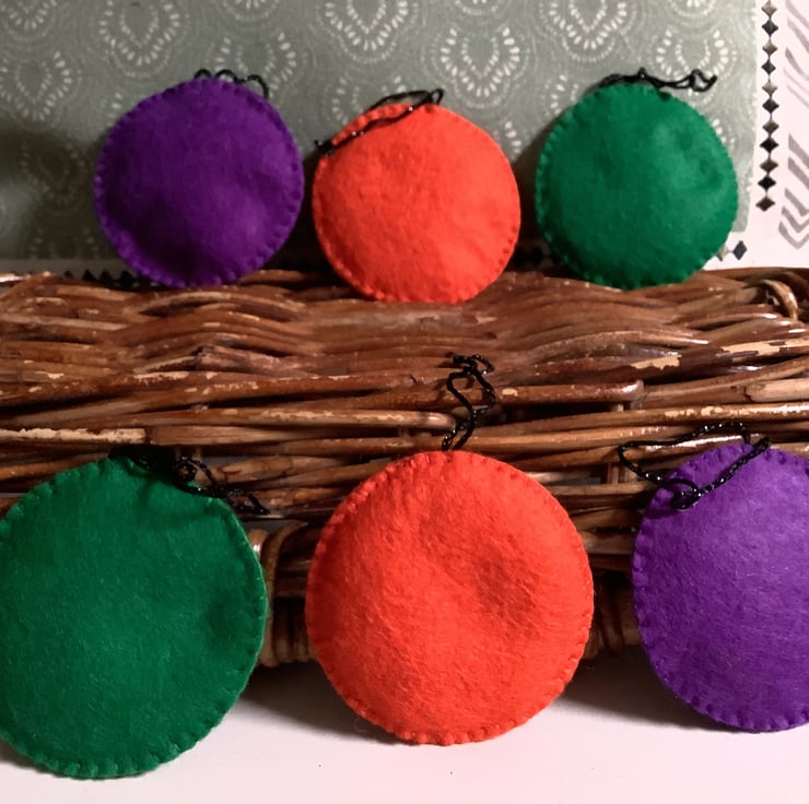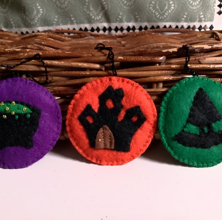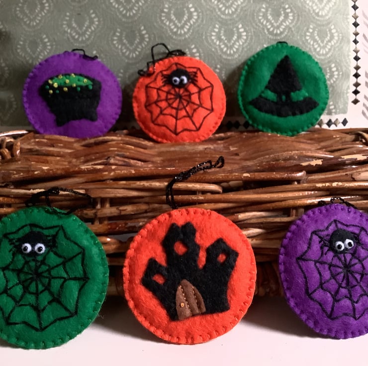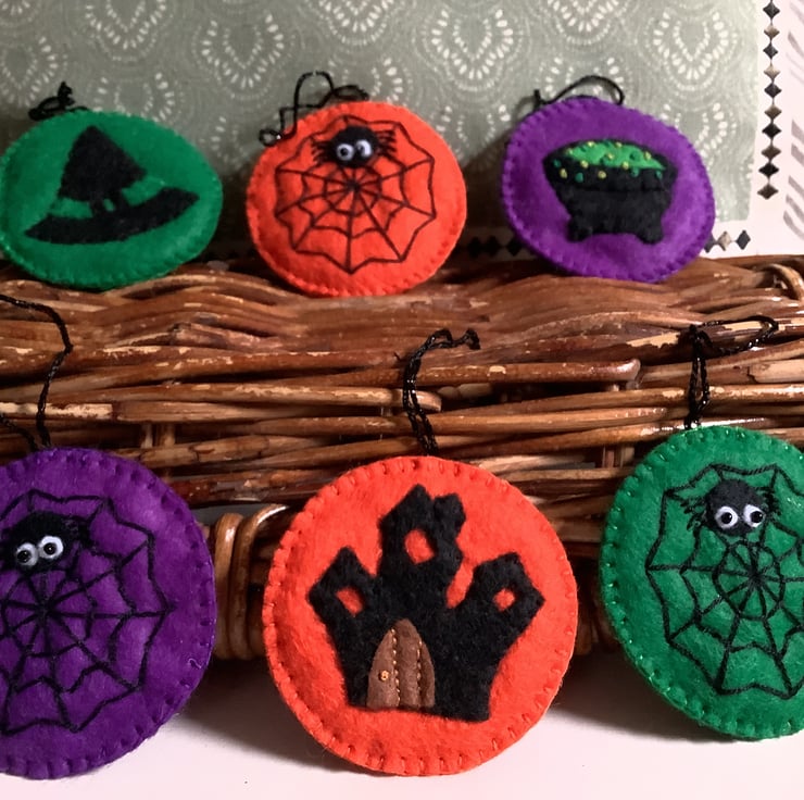 Set of six hanging decorations perfect for decorating your home this Halloween. In traditional seasonal colours they are embroidered with spiders webs, a cauldron, a haunted house and witches hat. Each has a black sparkly thread for hanging. They are made from felt and lightly stuffed.