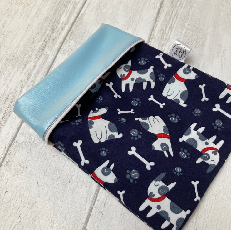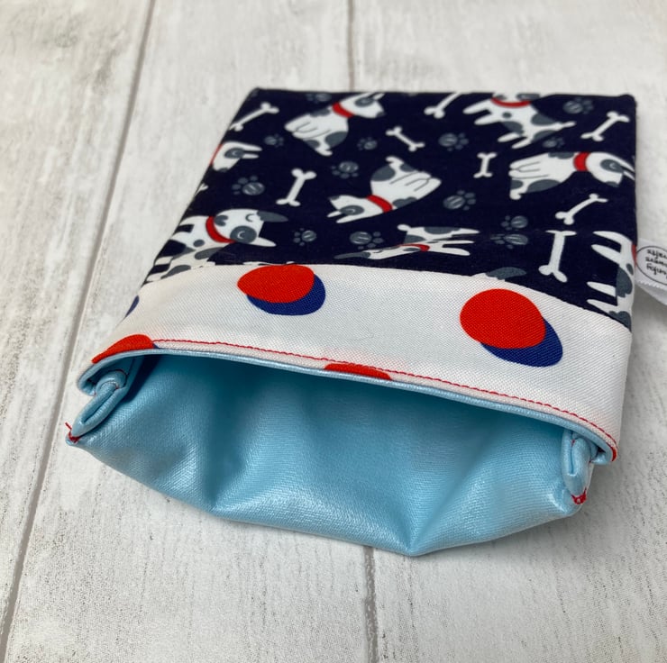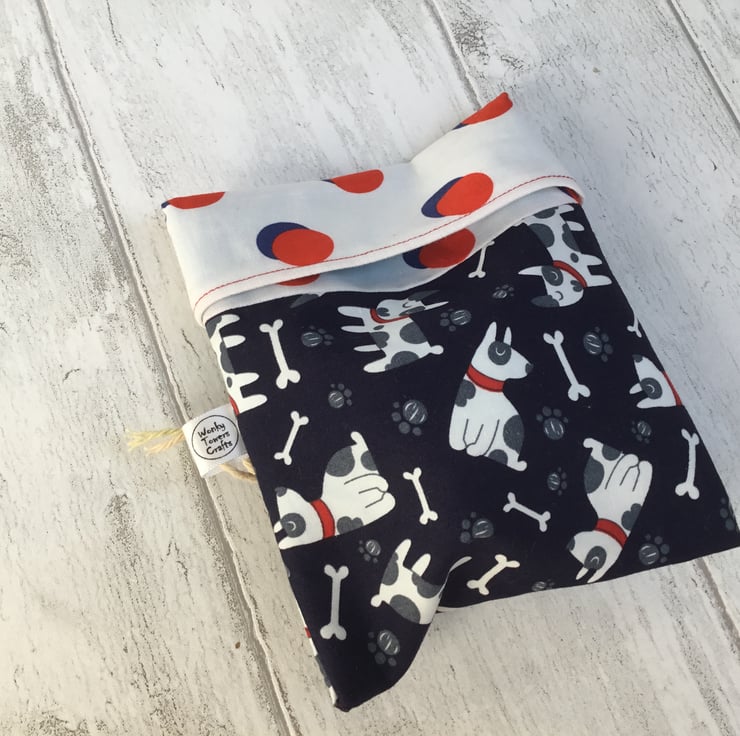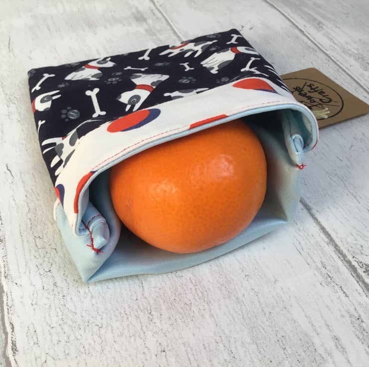 Snack bags measure approximately 12cm x 14cm. This one is made from a navy blue cotton fabric decorated with cartoon dogs and teamed with a red and blue spotty fabric. The lining is pale blue. It is made a bit like a pillowcase - a simple flap folds over and keeps your snack safely in the bag. There are no poppers or Velcro to catch crumbs and it’s easy to keep them clean and hygienic - great for storing small things in the fridge and for when you are out and about.