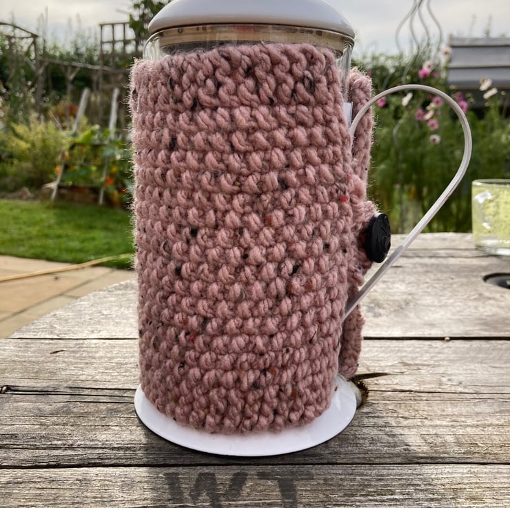 The cosy is designed to fit an 8 cup cafetiere and fastens in the middle with a single wooden button. It can be used indoors or out!